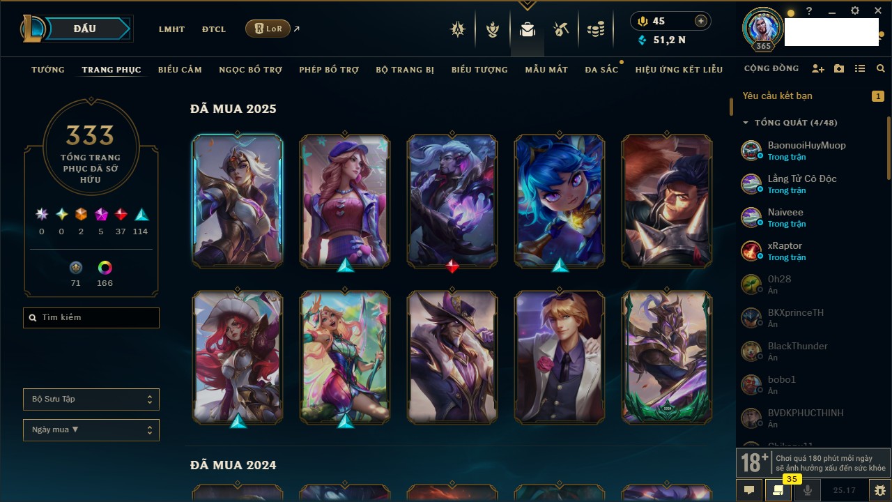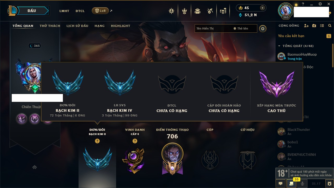 Rank Đơn: Bạc IIKhung: Bạch kimTướng: 169 - Còn 81813 THXTrang Phục: 301Rank ĐTCL: Chưa RankLinh Thú: 140