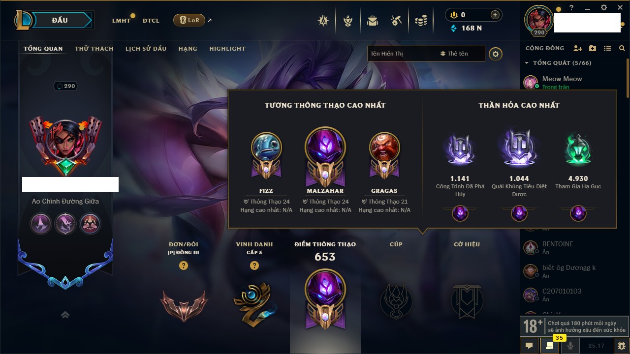 Rank Đơn: Bạch Kim IIKhung: Bạch kimTướng: 171 - Còn 316137 THXTrang Phục: 89Rank ĐTCL: Bạch Kim IIILinh Thú: 94