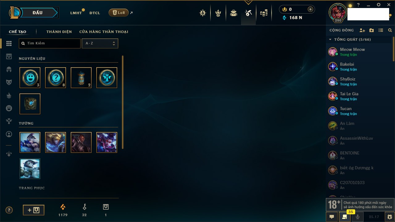 Rank Đơn: Lục Bảo IVKhung: VàngTướng: 171 - Còn 154648 THXTrang Phục: 203Rank ĐTCL: Bạch Kim IVLinh Thú: 69