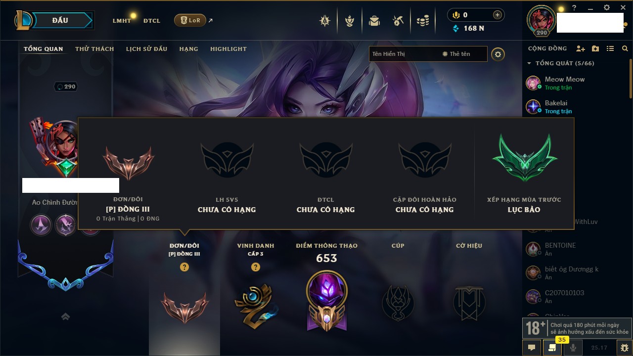 Rank Đơn: Đồng IIKhung: ĐồngTướng: 170 - Còn 95773 THXTrang Phục: 170Rank ĐTCL: Chưa RankLinh Thú: 32