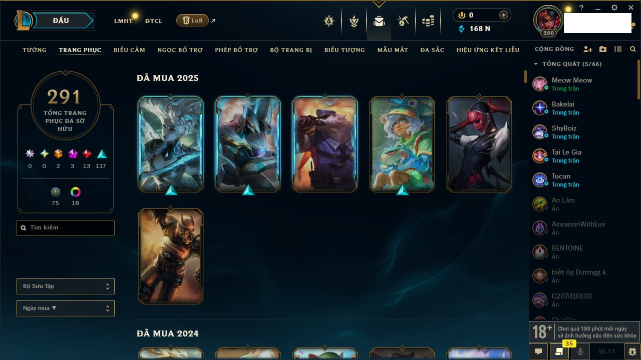 Rank Đơn: Vàng IIKhung: VàngTướng: 170 - Còn 243330 THXTrang Phục: 230Rank ĐTCL: Chưa RankLinh Thú: 68
