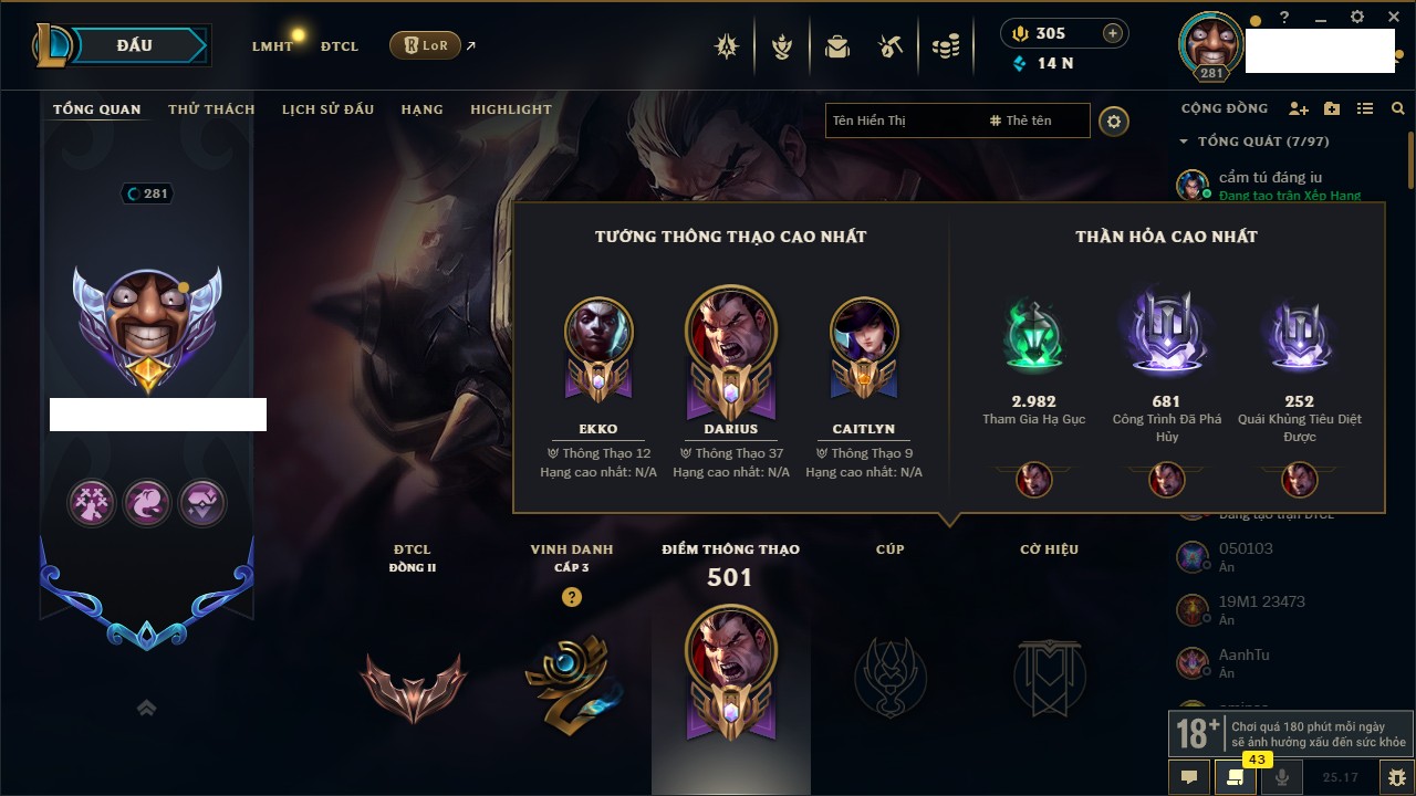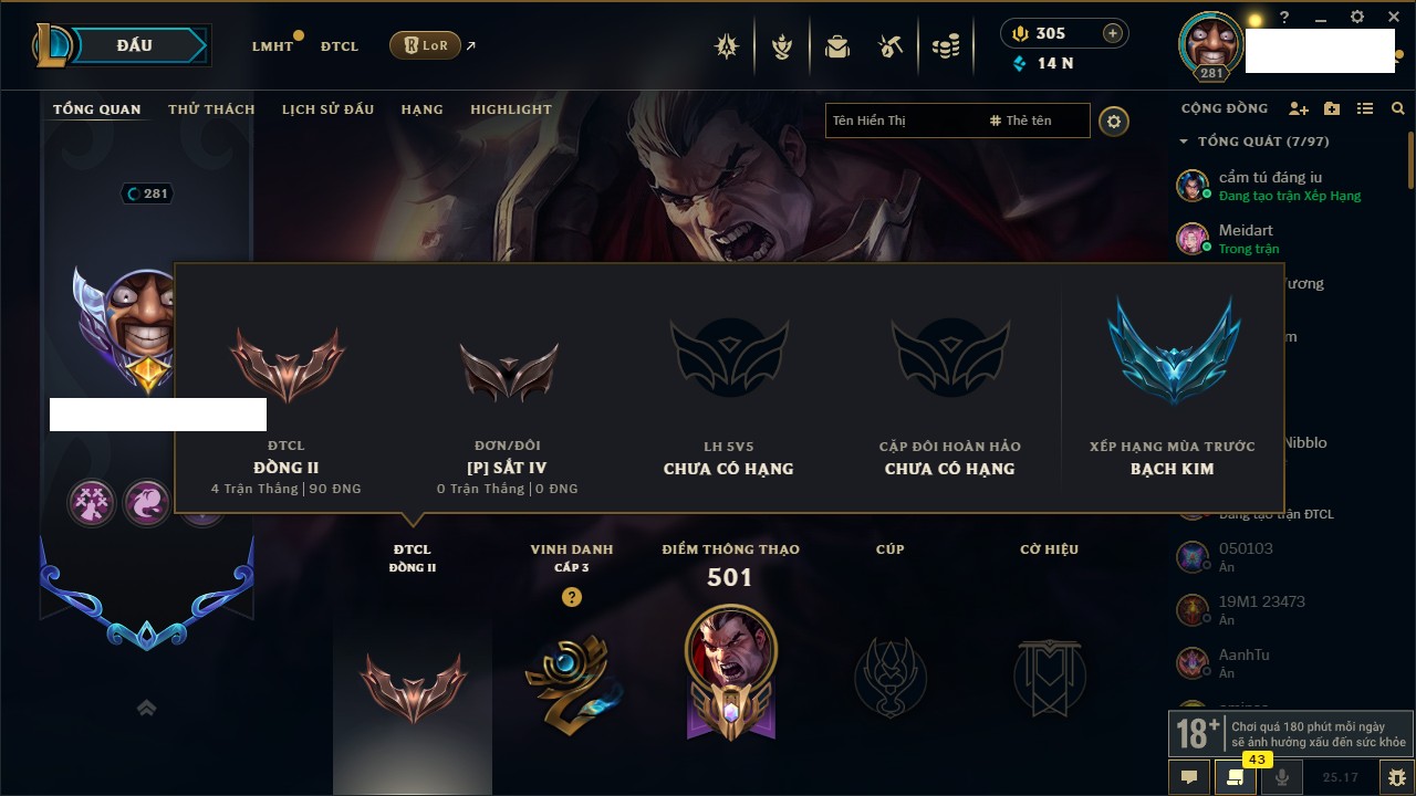 Rank Đơn: Bạch Kim IIKhung: Bạch kimTướng: 171 - Còn 141298 THXTrang Phục: 274Rank ĐTCL: Bạch Kim IILinh Thú: 188