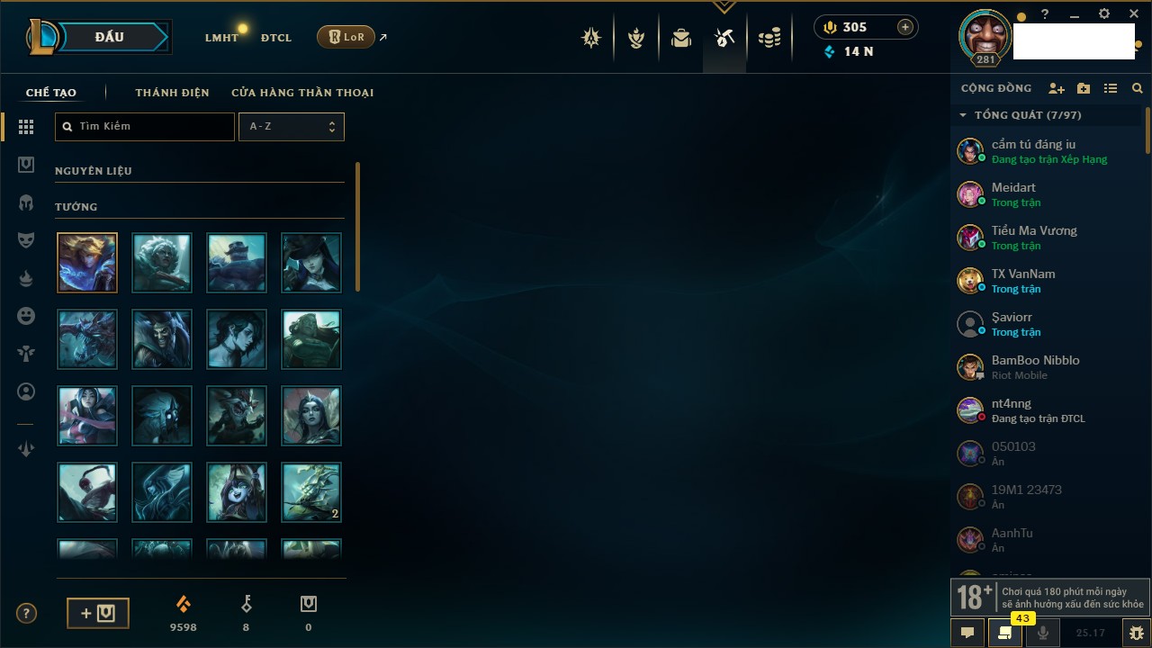 Rank Đơn: Vàng IIIKhung: VàngTướng: 171 - Còn 224994 THXTrang Phục: 273Rank ĐTCL: Vàng IVLinh Thú: 192