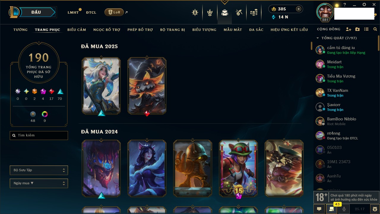 Rank Đơn: Vàng IIIKhung: VàngTướng: 171 - Còn 88128 THXTrang Phục: 329Rank ĐTCL: Chưa RankLinh Thú: 41