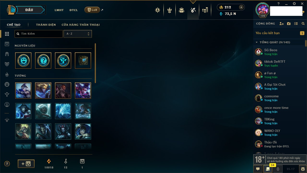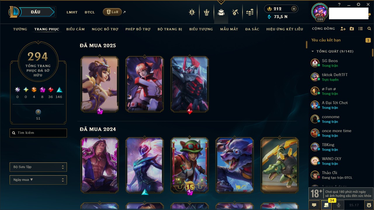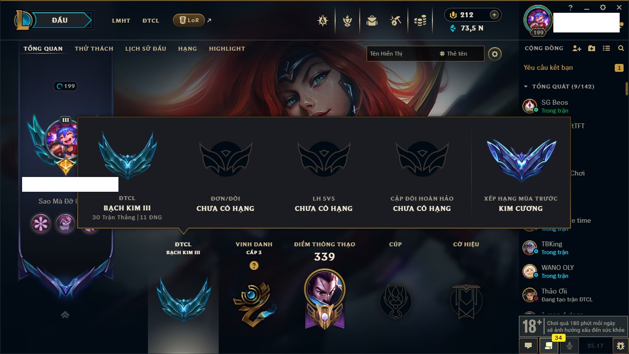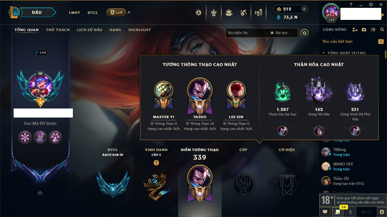 Rank Đơn: Vàng IKhung: Bạch kimTướng: 170 - Còn 212450 THXTrang Phục: 214Rank ĐTCL: Bạch Kim IVLinh Thú: 221