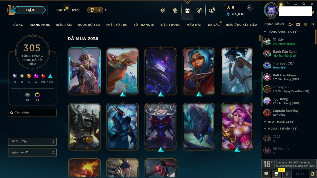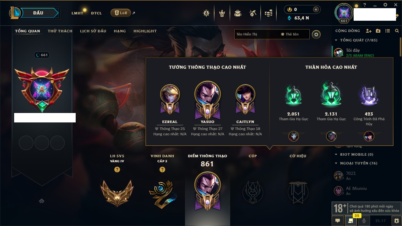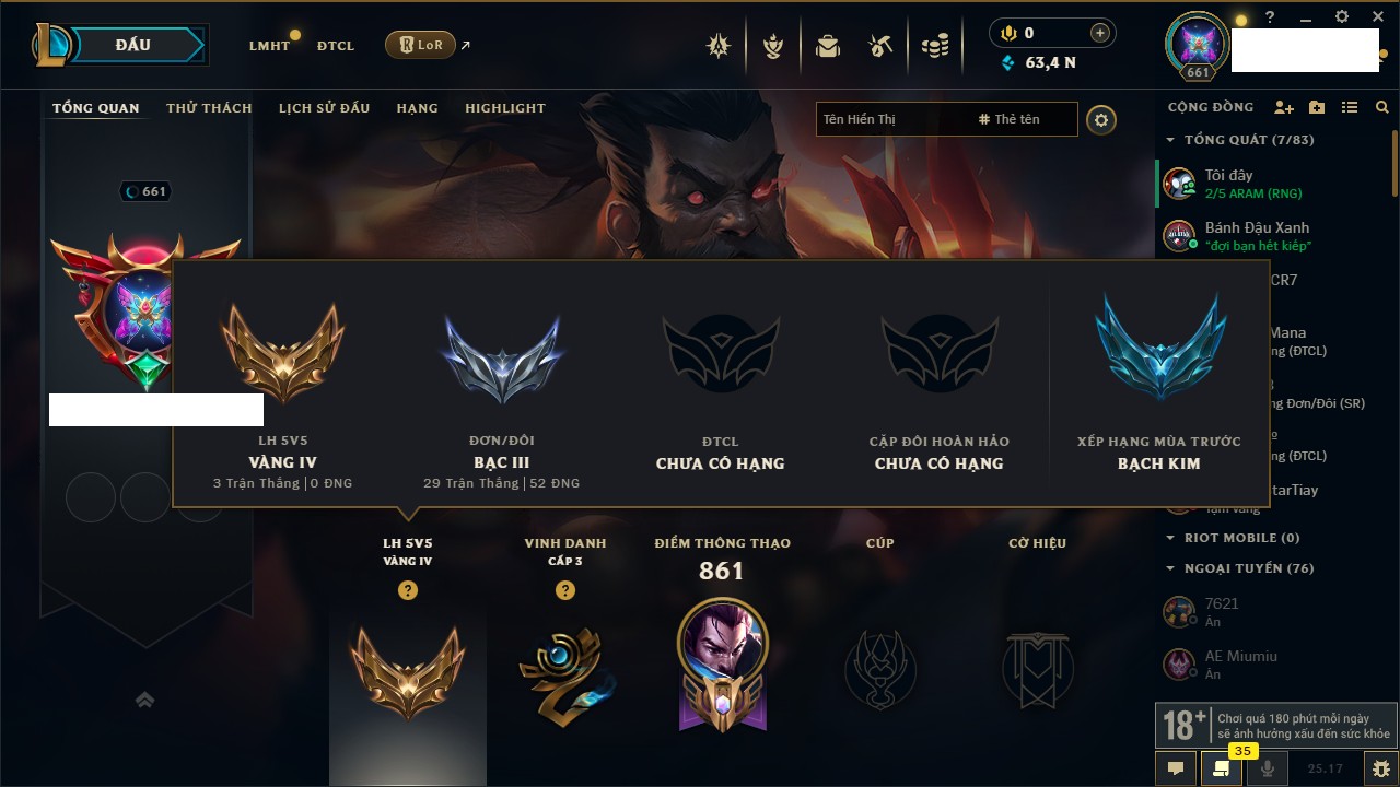 Rank Đơn: Vàng IKhung: Bạch kimTướng: 170 - Còn 212450 THXTrang Phục: 214Rank ĐTCL: Bạch Kim IVLinh Thú: 221