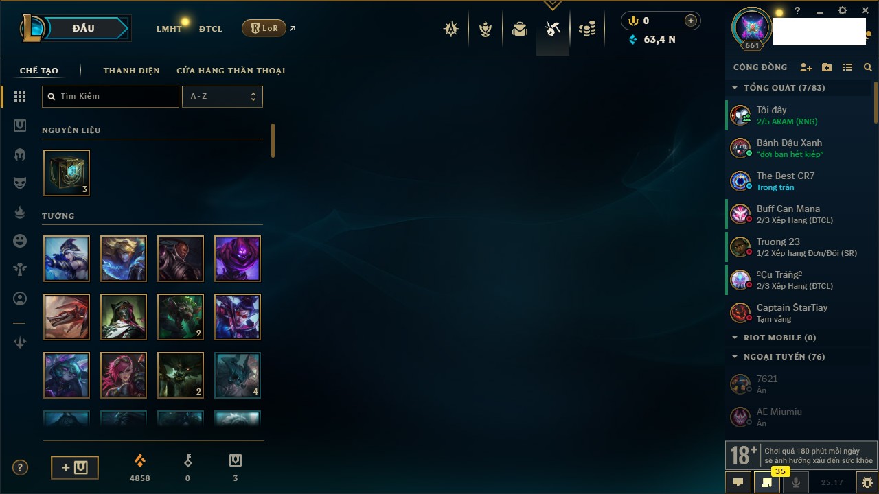 Rank Đơn: Bạch Kim IIIKhung: Bạch kimTướng: 170 - Còn 61079 THXTrang Phục: 352Rank ĐTCL: Sắt IILinh Thú: 70