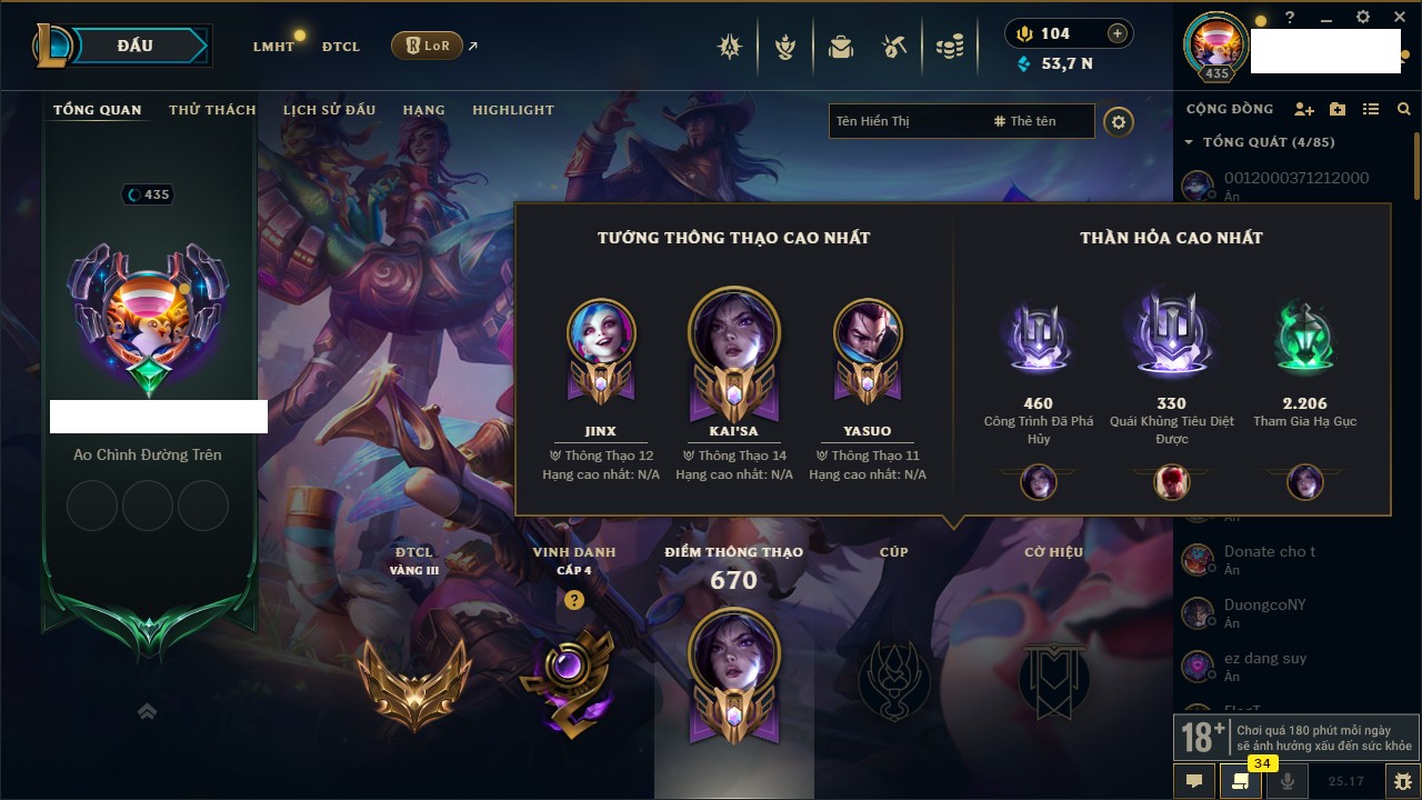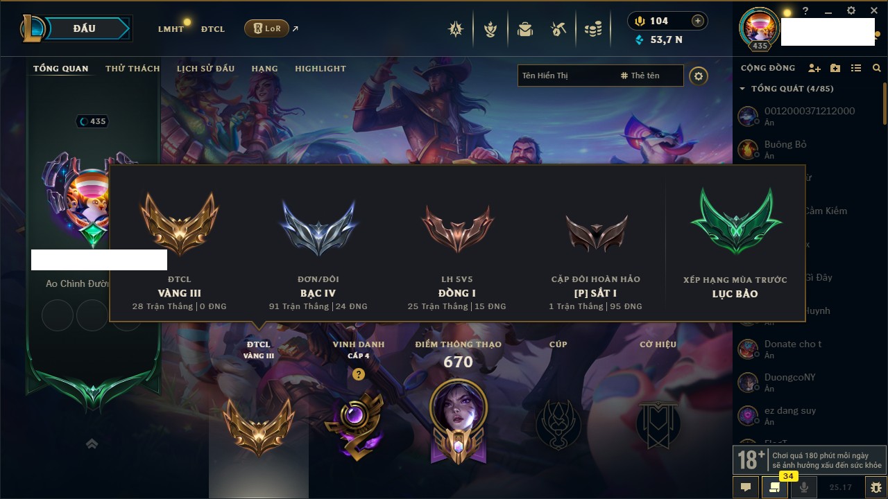 Rank Đơn: Lục Bảo IVKhung: Bạch kimTướng: 171 - Còn 128452 THXTrang Phục: 193Rank ĐTCL: Bạc IIILinh Thú: 100