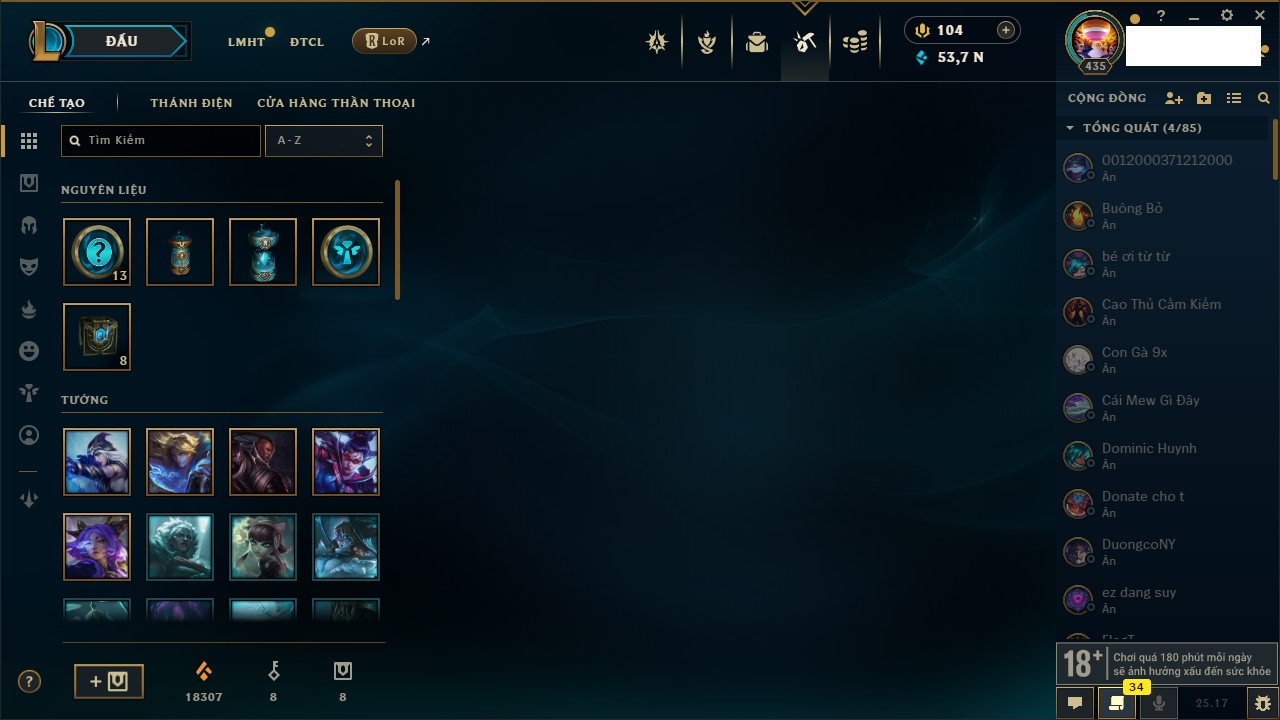 Rank Đơn: Vàng IIIKhung: BạcTướng: 171 - Còn 101359 THXTrang Phục: 88Rank ĐTCL: Kim Cương IVLinh Thú: 200