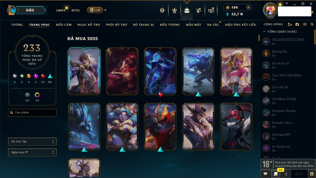 Rank Đơn: Đồng IKhung: ĐồngTướng: 168 - Còn 11447 THXTrang Phục: 245Rank ĐTCL: Chưa RankLinh Thú: 53