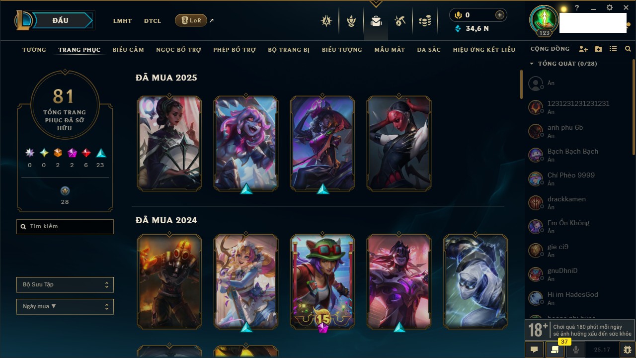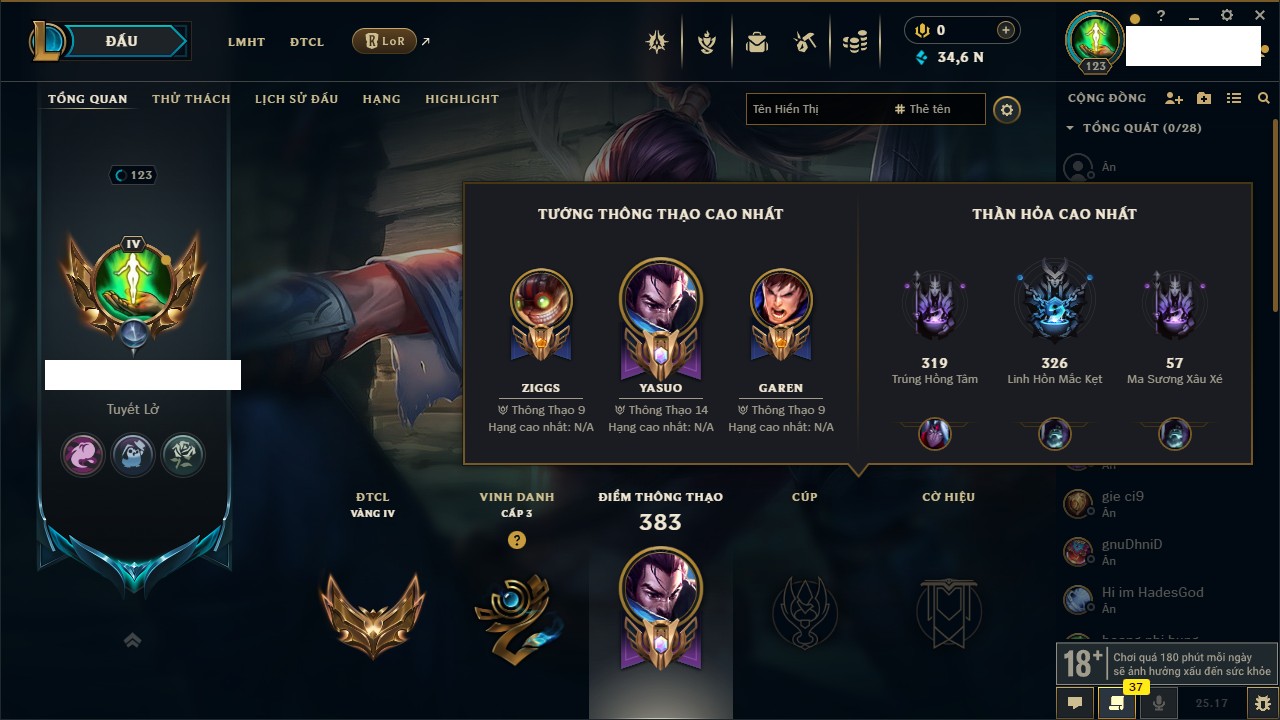 Rank Đơn: Chưa RankKhung: Chưa có khungTướng: 171 - Còn 164047 THXTrang Phục: 173Rank ĐTCL: Chưa RankLinh Thú: 77