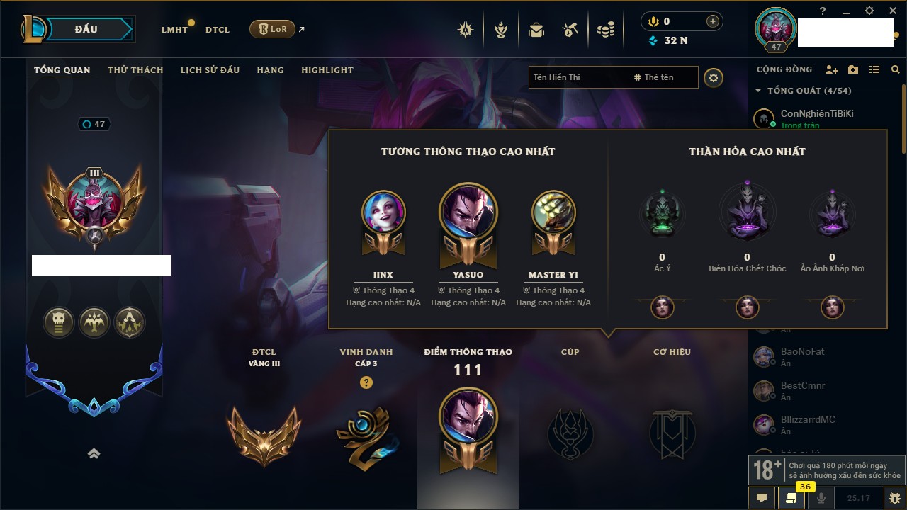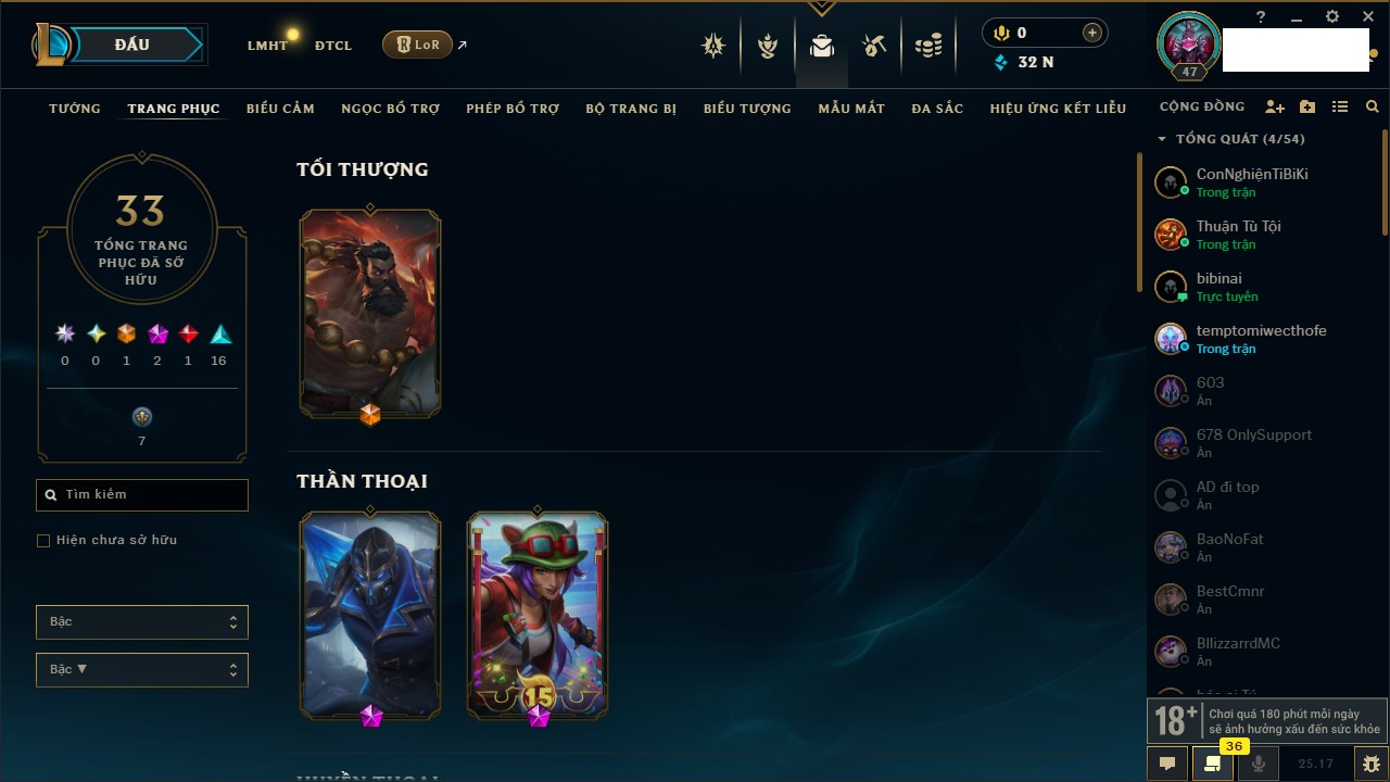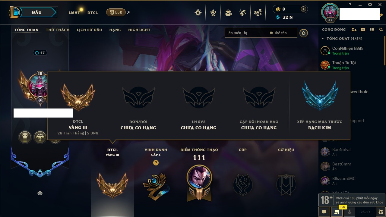 Rank Đơn: Bạch Kim IIKhung: Bạch kimTướng: 171 - Còn 316137 THXTrang Phục: 89Rank ĐTCL: Bạch Kim IIILinh Thú: 94