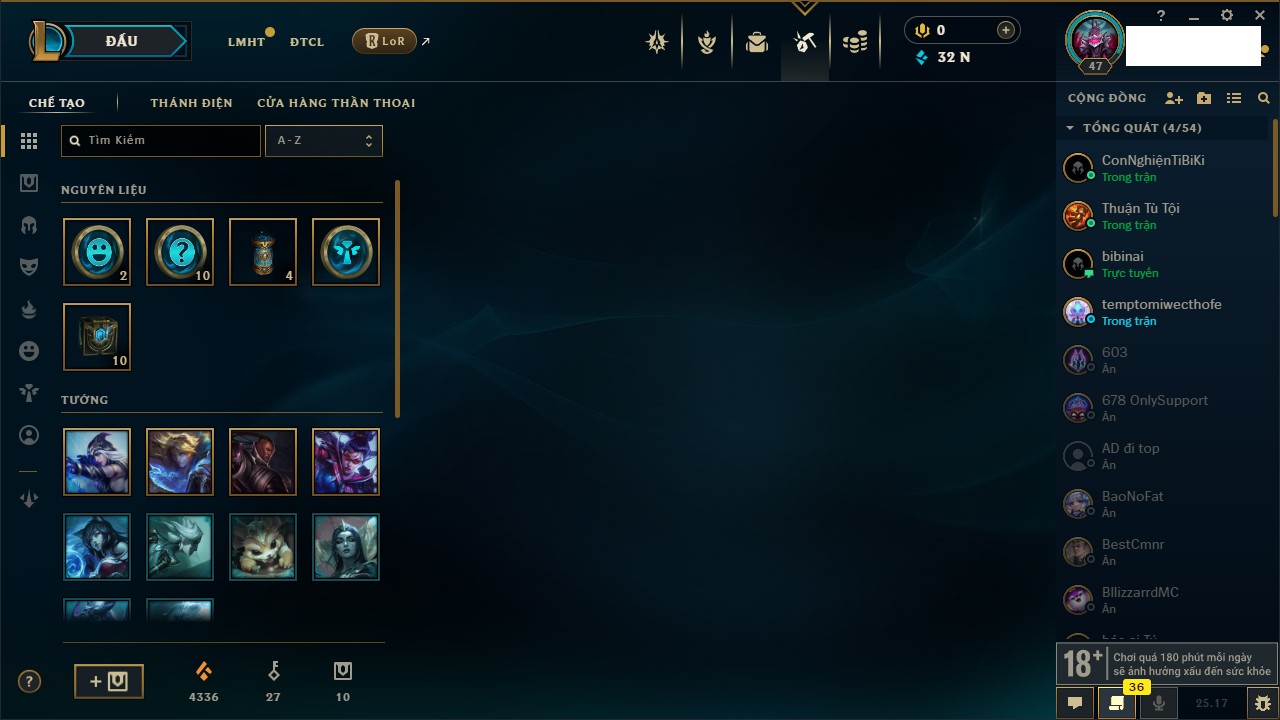 Rank Đơn: Lục Bảo IVKhung: VàngTướng: 171 - Còn 154648 THXTrang Phục: 203Rank ĐTCL: Bạch Kim IVLinh Thú: 69