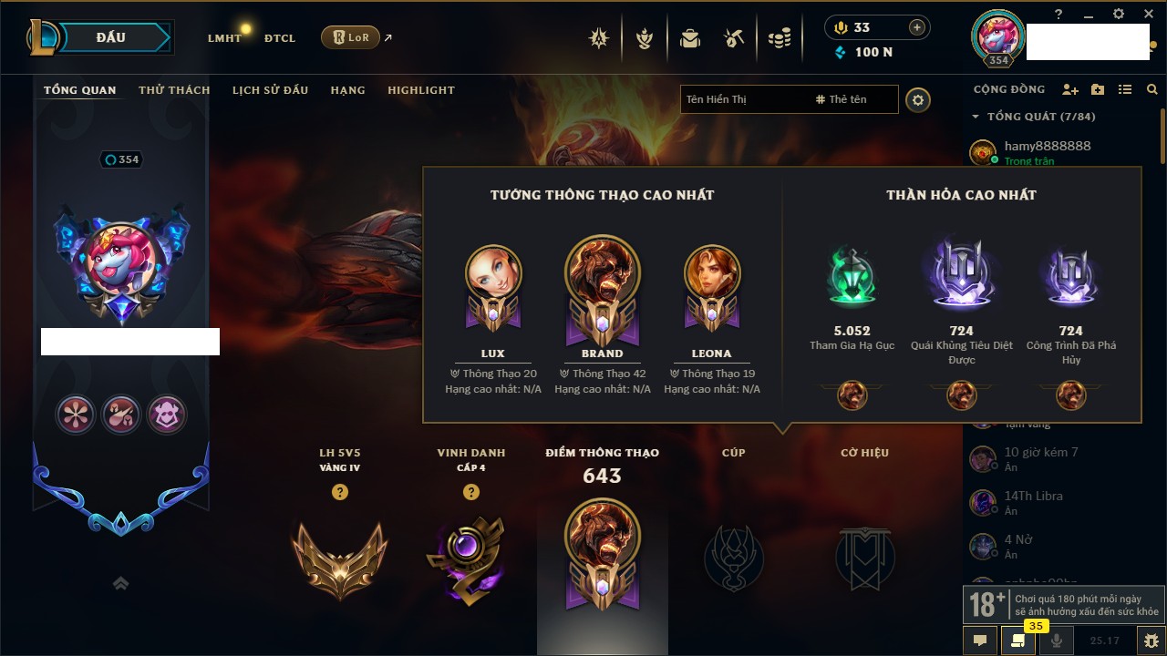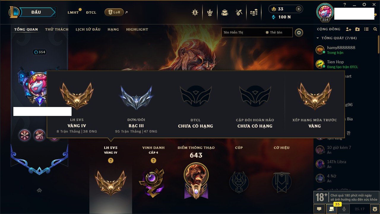 Rank Đơn: Lục Bảo IVKhung: VàngTướng: 171 - Còn 154648 THXTrang Phục: 203Rank ĐTCL: Bạch Kim IVLinh Thú: 69