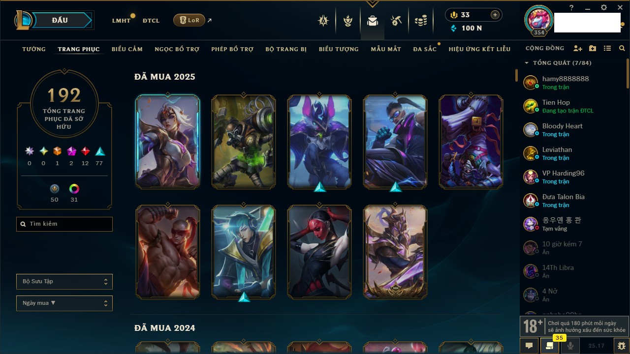 Rank Đơn: Bạch Kim IIKhung: Bạch kimTướng: 171 - Còn 316137 THXTrang Phục: 89Rank ĐTCL: Bạch Kim IIILinh Thú: 94