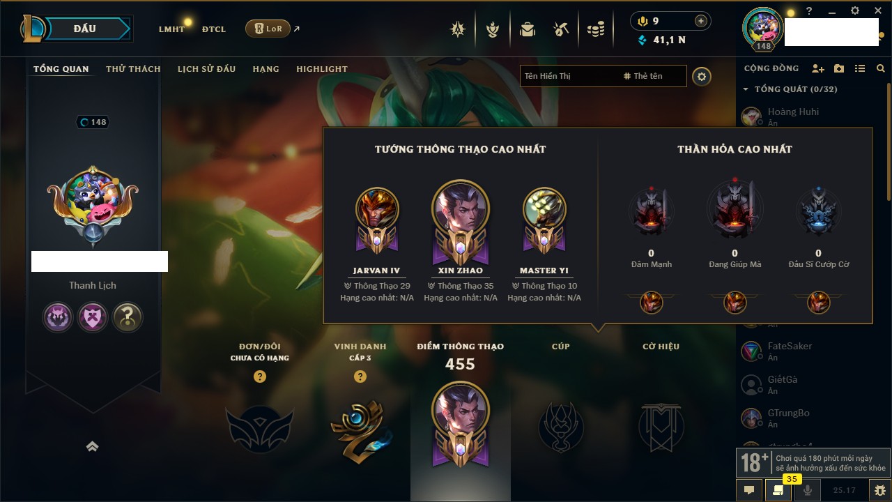 Rank Đơn: Chưa Rank Khung: Đồng Tướng: 145 - Còn 4341 THX Trang Phục: 30 Rank ĐTCL: Chưa Rank Linh Thú: 82