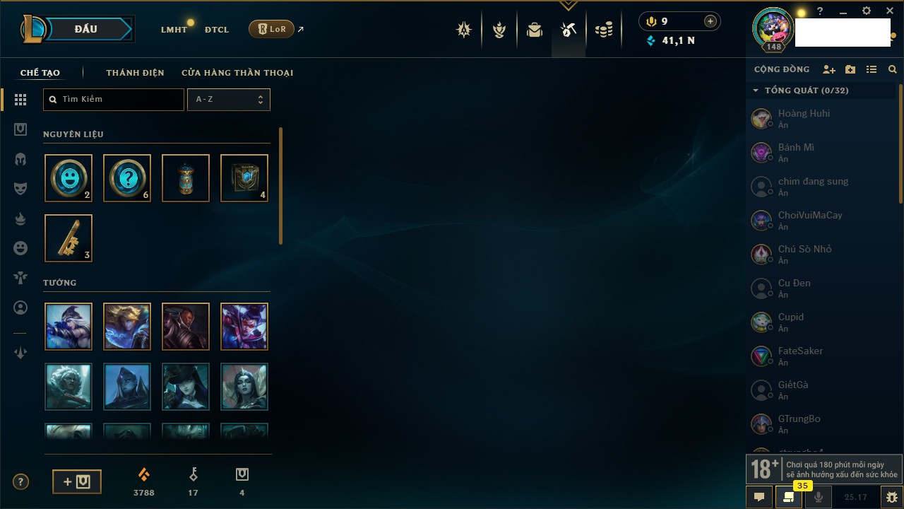 Rank Đơn: Chưa Rank Khung: Vàng Tướng: 171 - Còn 140250 THX Trang Phục: 80 Rank ĐTCL: Chưa Rank Linh Thú: 68