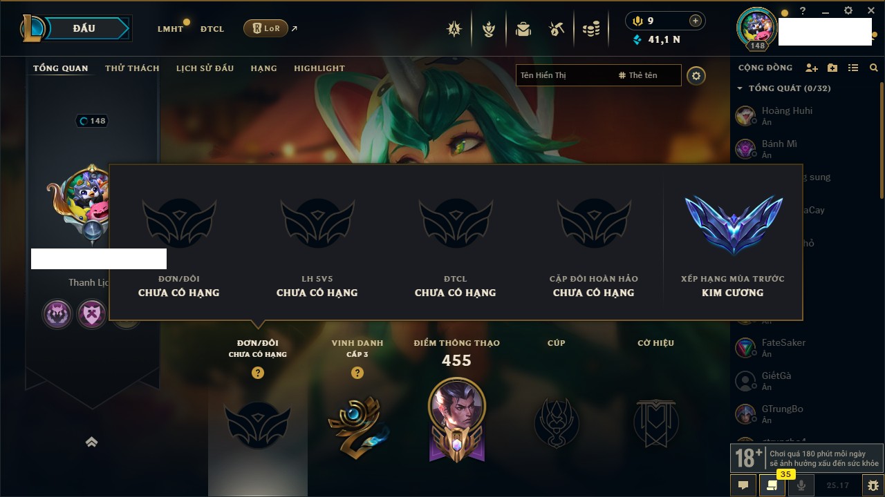 Rank Đơn: Bạc I Khung: Chưa có khung Tướng: 153 - Còn 4550 THX Trang Phục: 192 Rank ĐTCL: Chưa Rank Linh Thú: 35