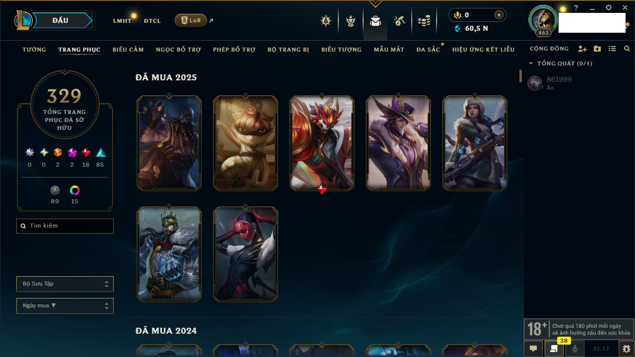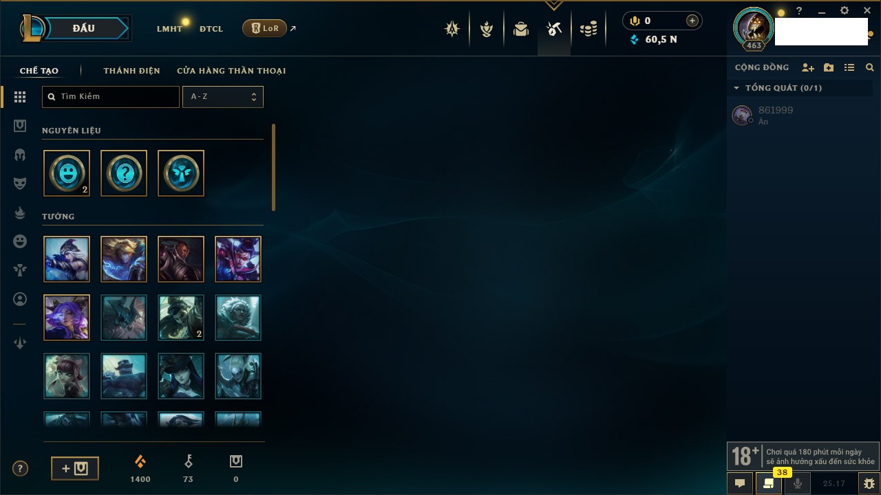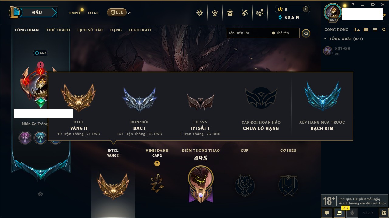 Rank Đơn: Vàng IKhung: BạcTướng: 171 - Còn 60584 THXTrang Phục: 286Rank ĐTCL: Vàng IIILinh Thú: 117