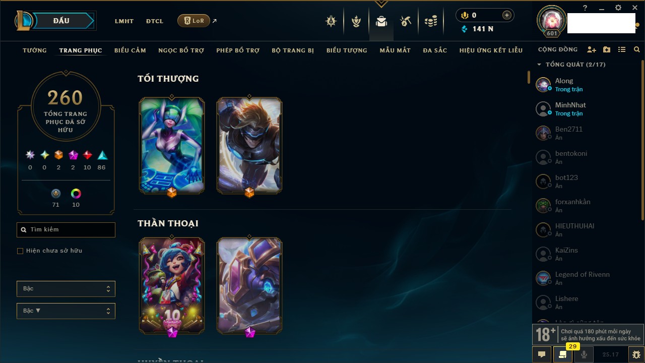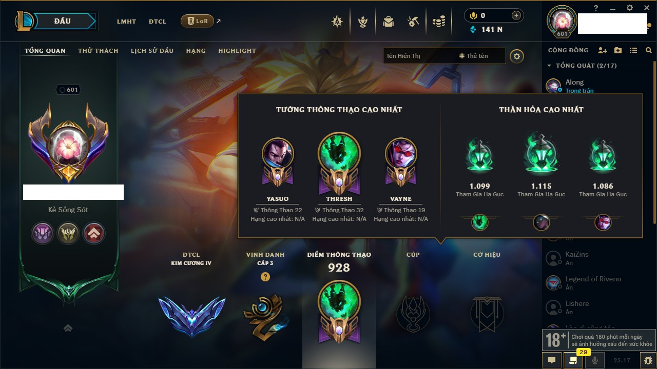 Rank Đơn: Vàng IIKhung: VàngTướng: 171 - Còn 219803 THXTrang Phục: 254Rank ĐTCL: Chưa RankLinh Thú: 78