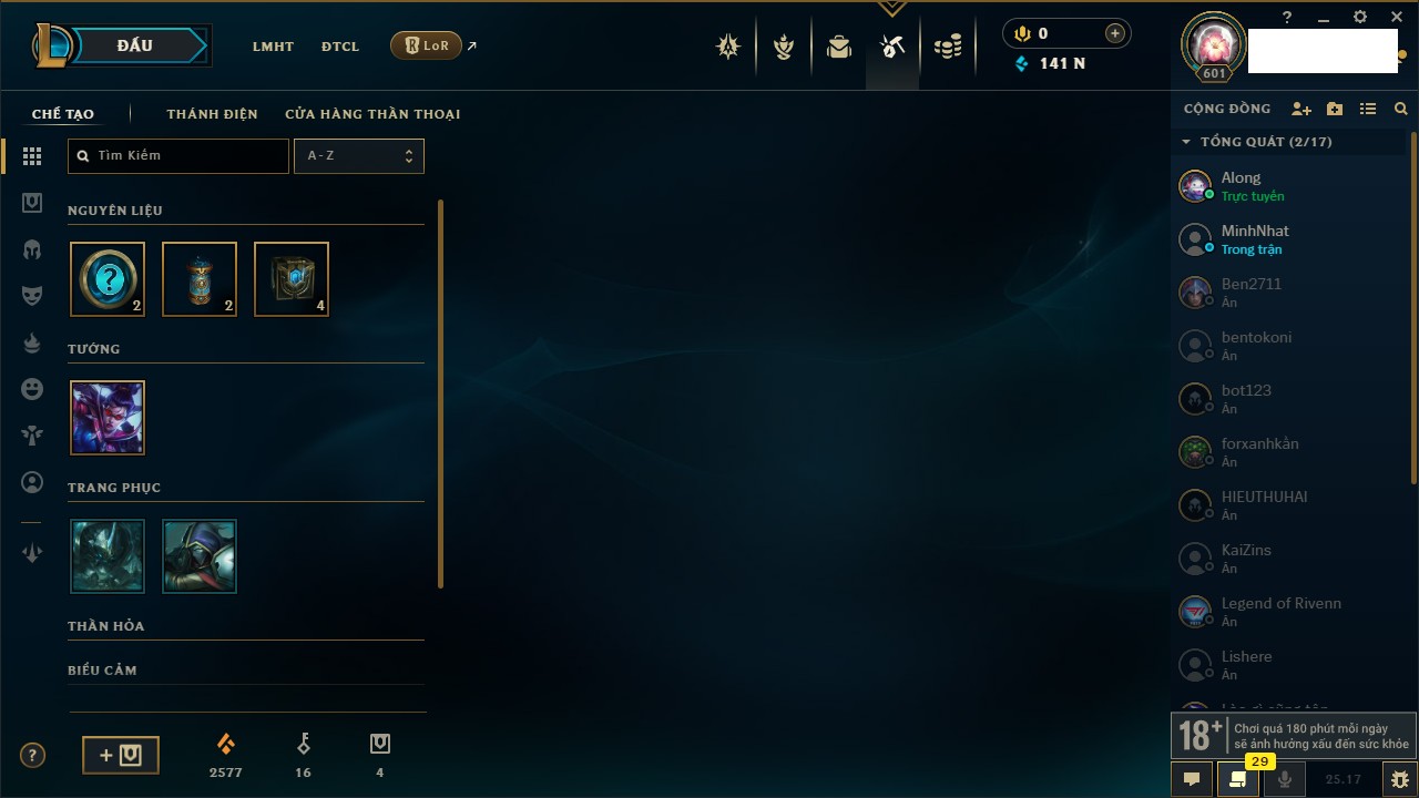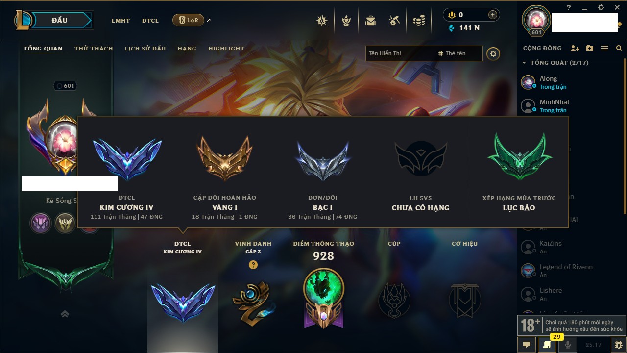 Rank Đơn: Vàng IIIKhung: VàngTướng: 171 - Còn 212486 THXTrang Phục: 201Rank ĐTCL: Bạc ILinh Thú: 79