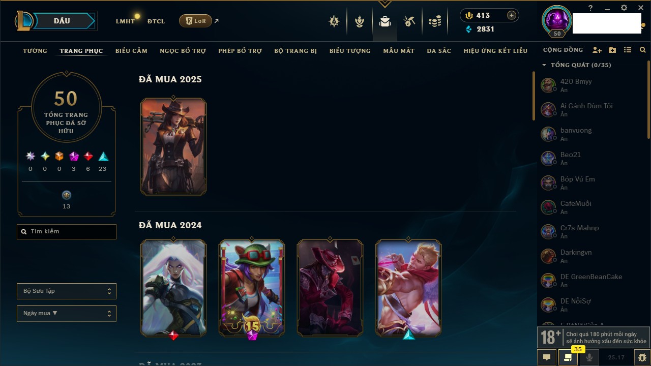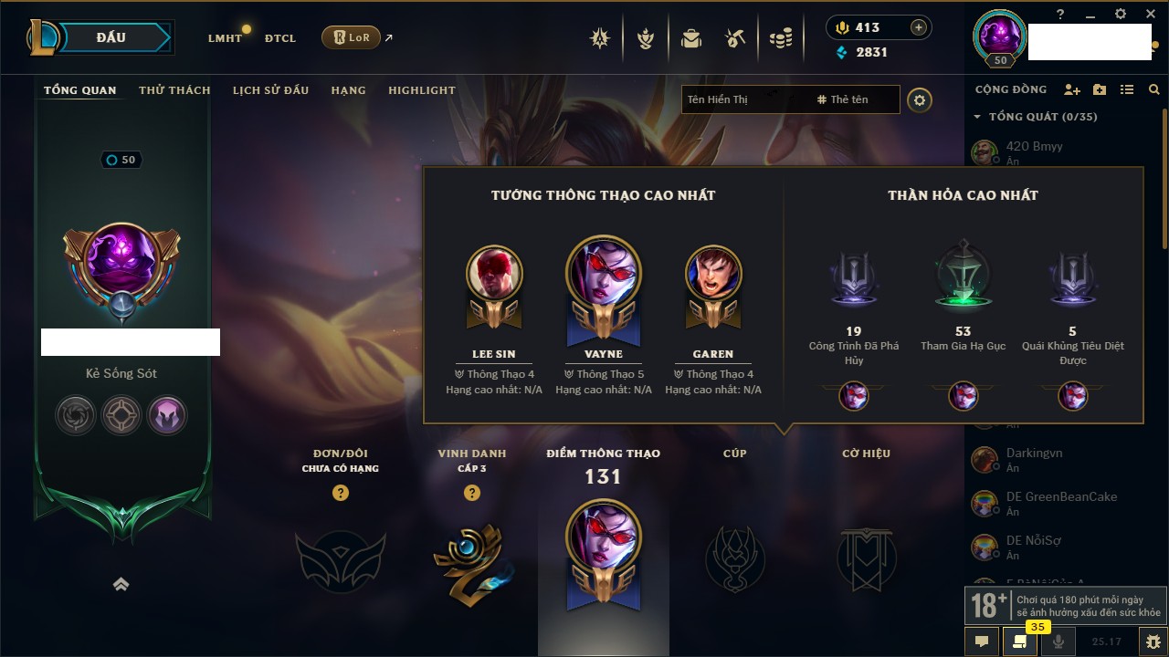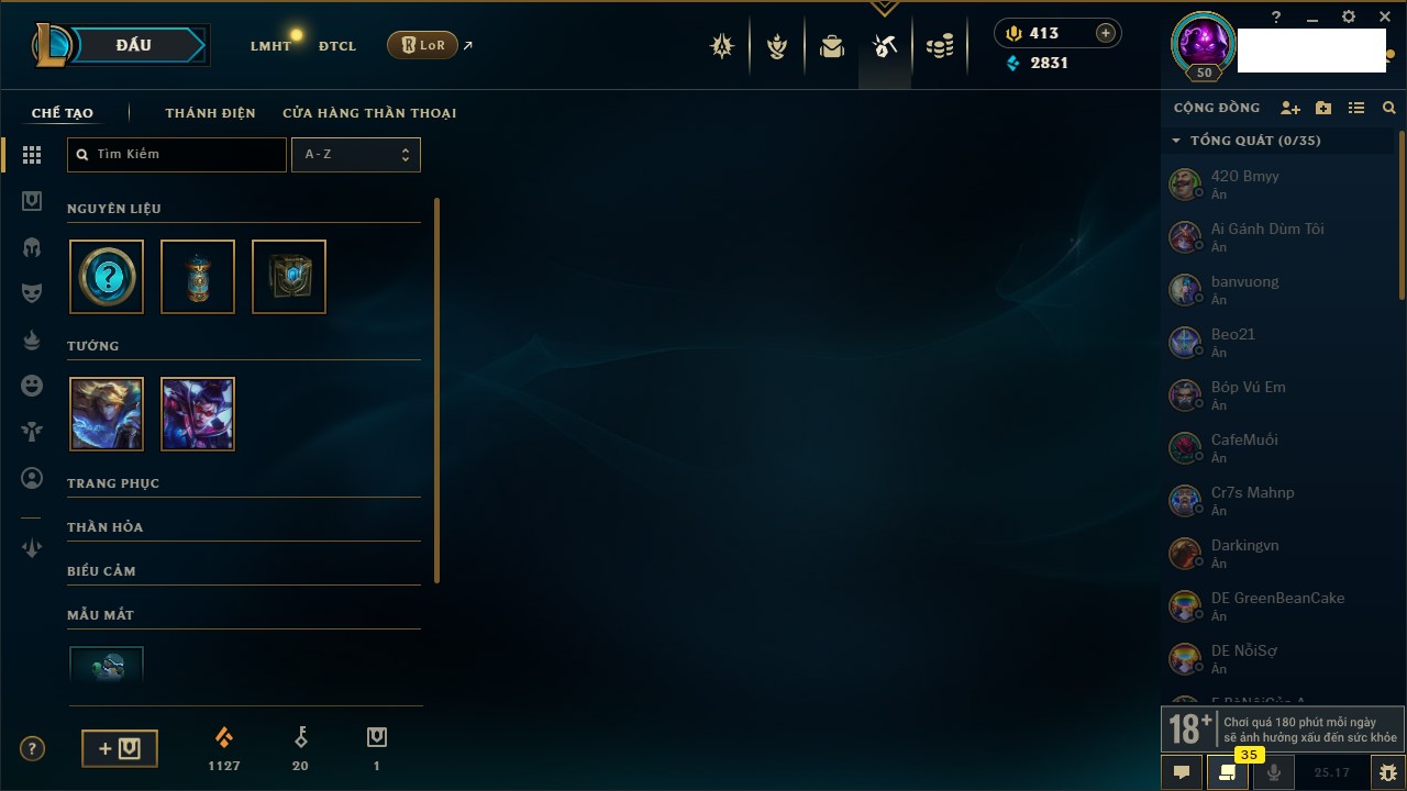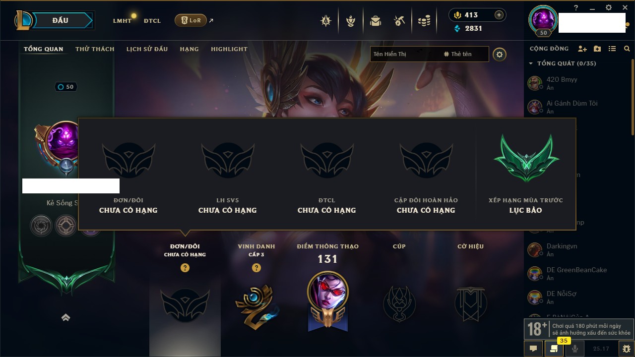 Rank Đơn: Chưa RankKhung: Chưa có khungTướng: 171 - Còn 164047 THXTrang Phục: 173Rank ĐTCL: Chưa RankLinh Thú: 77