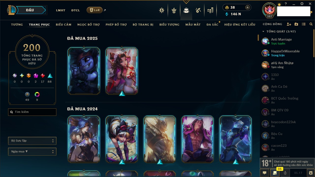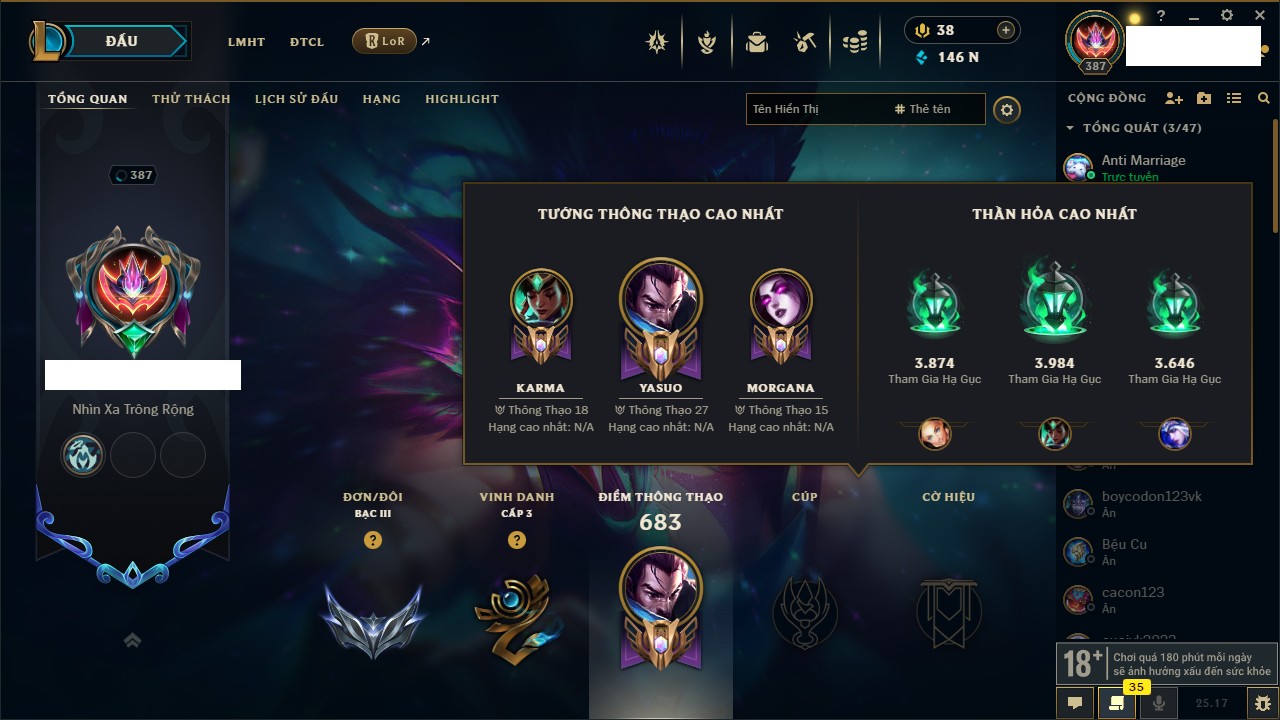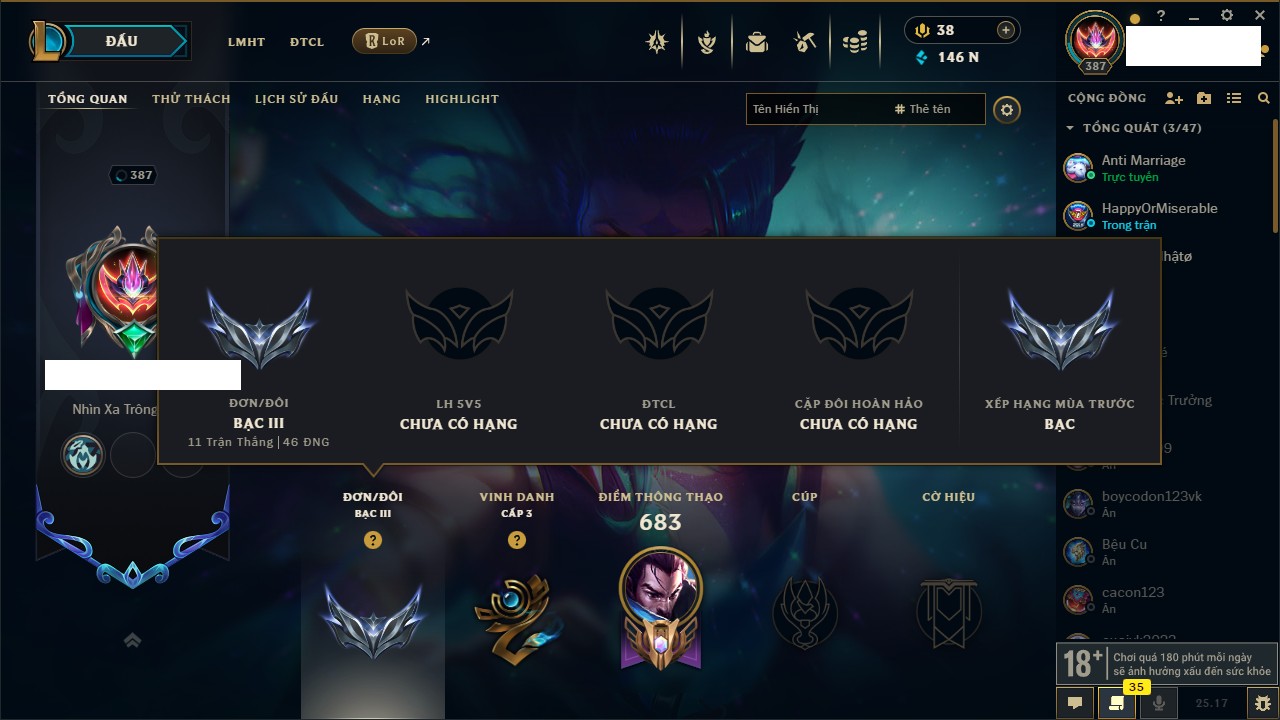 Rank Đơn: Đồng IIKhung: ĐồngTướng: 170 - Còn 66145 THXTrang Phục: 215Rank ĐTCL: Chưa RankLinh Thú: 52
