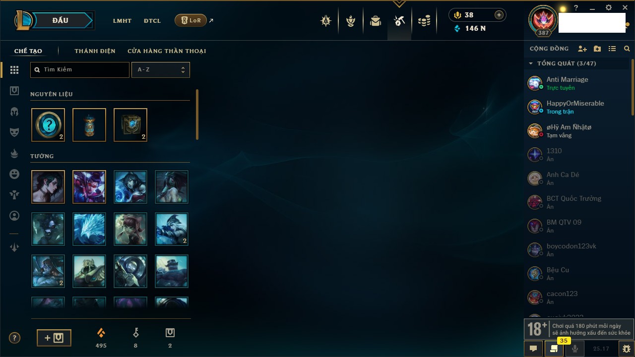 Rank Đơn: Vàng IIIKhung: BạcTướng: 171 - Còn 101359 THXTrang Phục: 88Rank ĐTCL: Kim Cương IVLinh Thú: 200