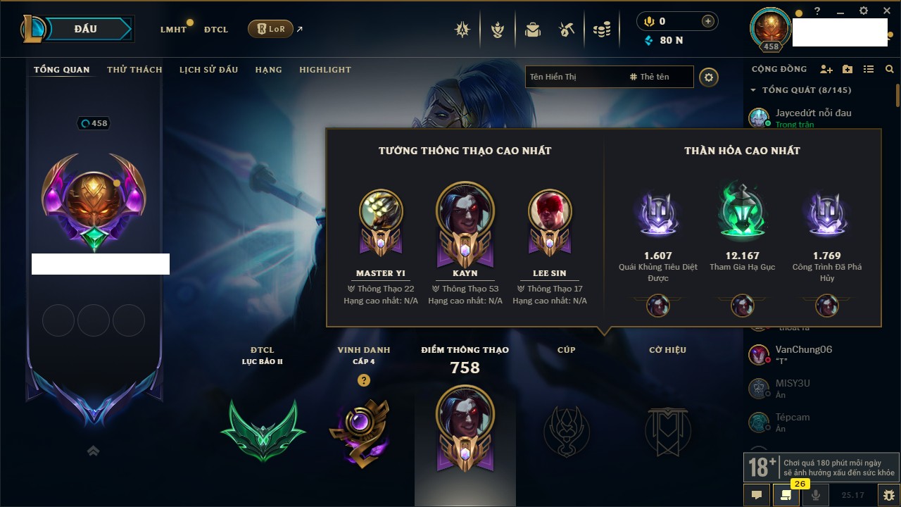 Rank Đơn: Vàng III Khung: Vàng Tướng: 171 - Còn 91047 THX Trang Phục: 98 Rank ĐTCL: Bạch Kim IV Linh Thú: 281