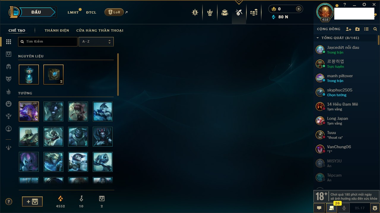 Rank Đơn: Chưa rank mùa nào Khung: Chưa có khung Tướng: 3 - Còn 3800 THX Trang Phục: 0 Rank ĐTCL: Chưa Rank Linh Thú: 31