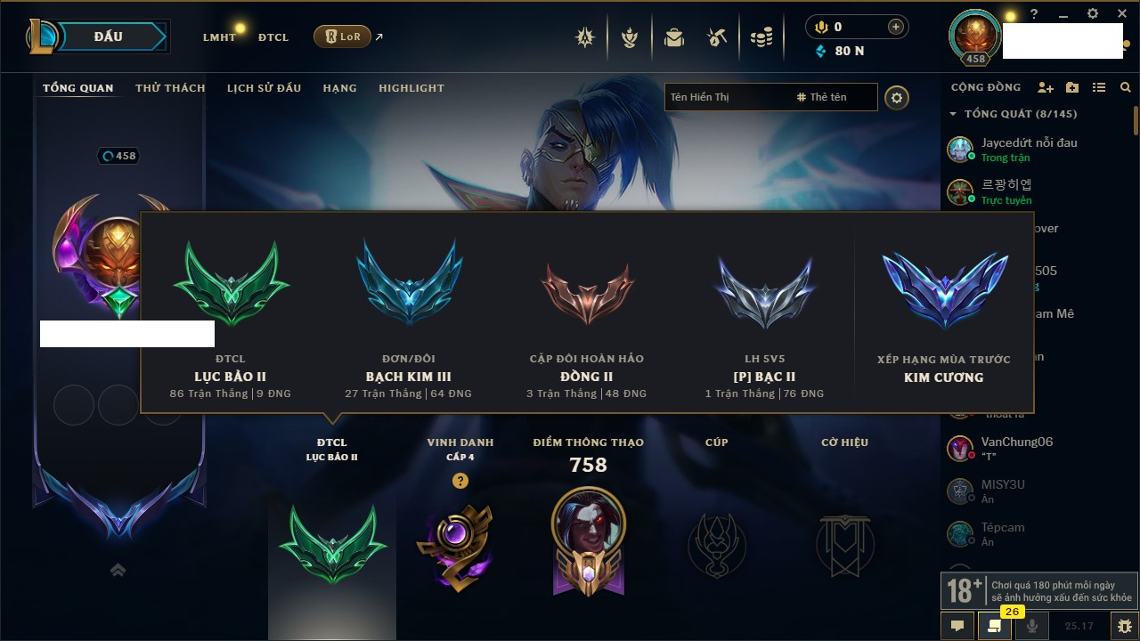 Rank Đơn: Bạc III Khung: Bạc Tướng: 170 - Còn 30078 THX Trang Phục: 225 Rank ĐTCL: Chưa Rank Linh Thú: 138