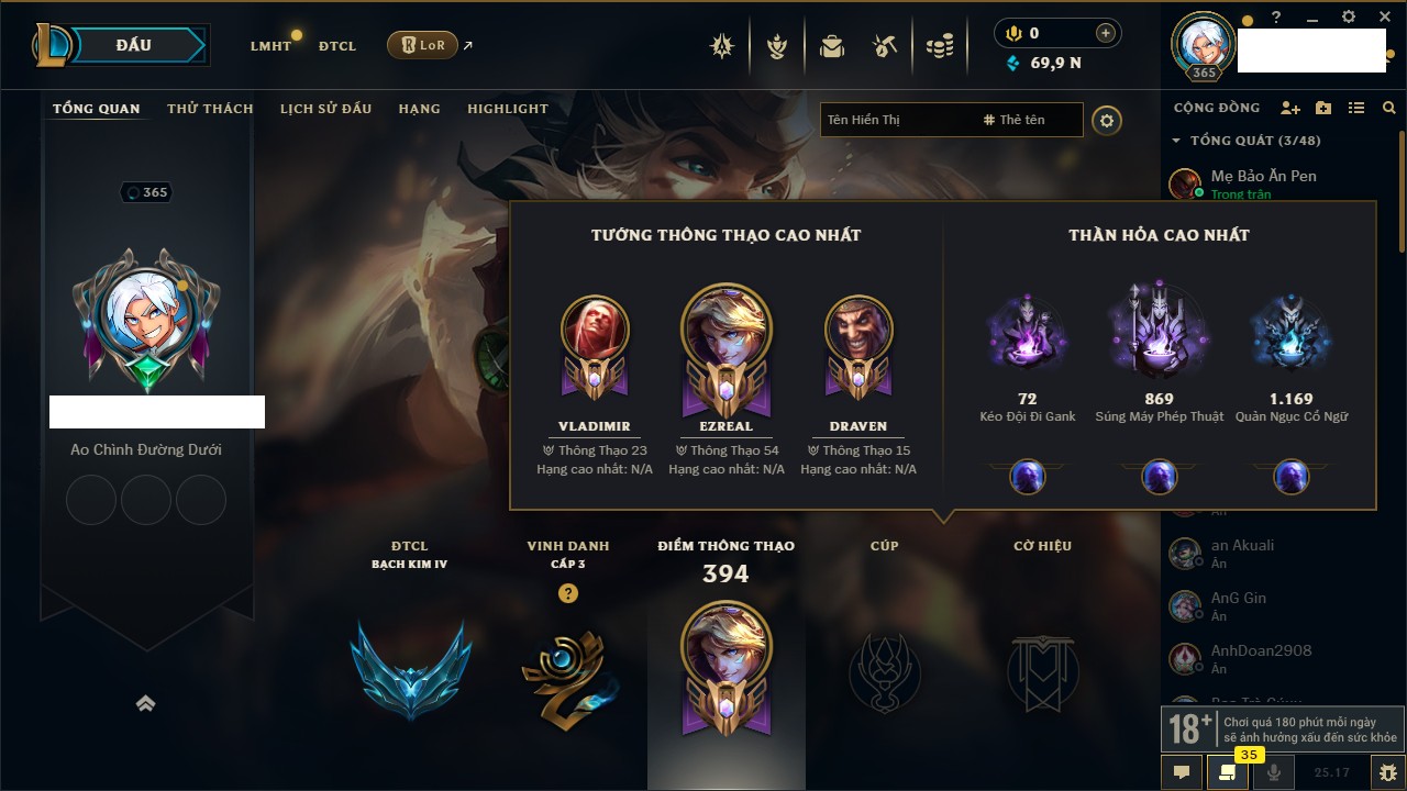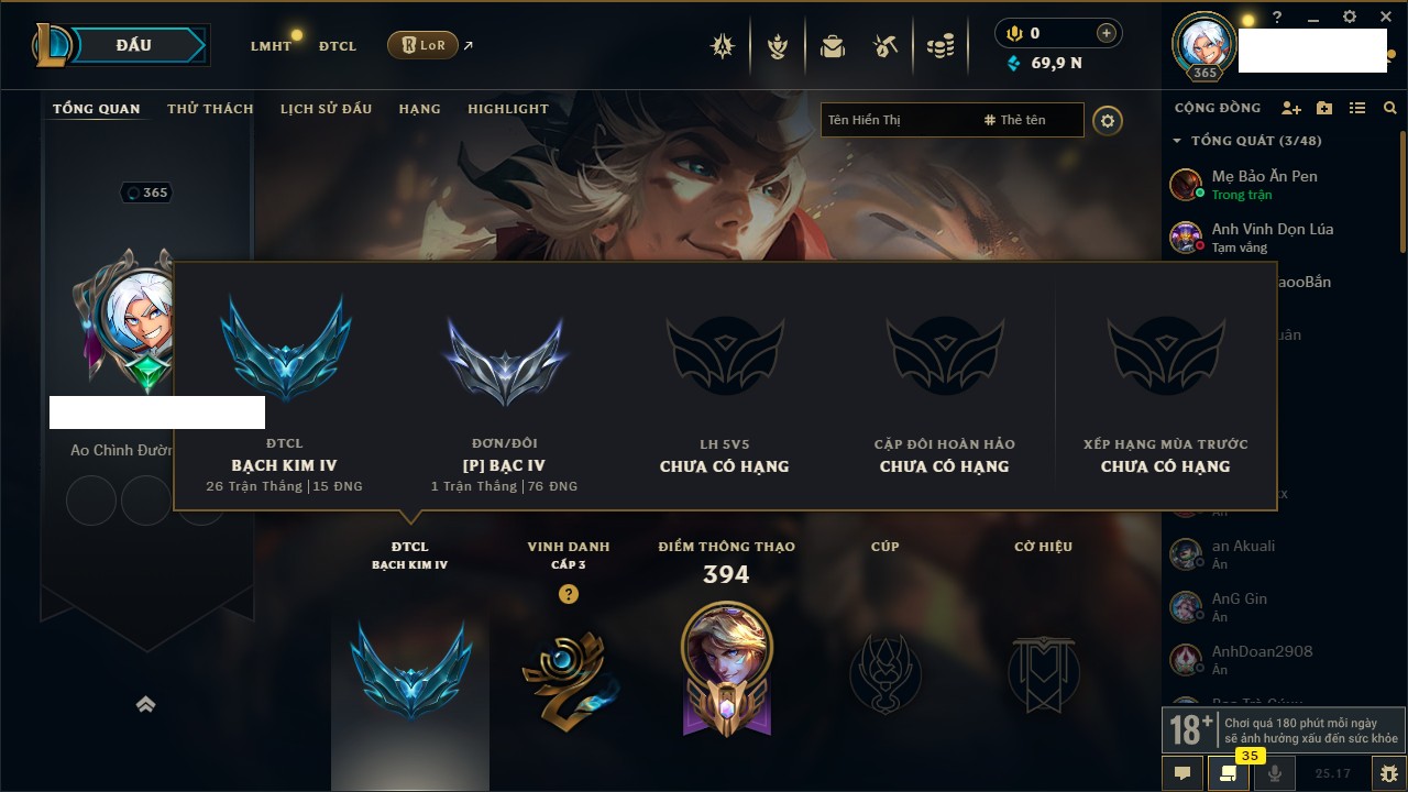 Rank Đơn: Vàng IIKhung: Bạch kimTướng: 172 - Còn 123420 THXTrang Phục: 231Rank ĐTCL: Bạch Kim IVLinh Thú: 213