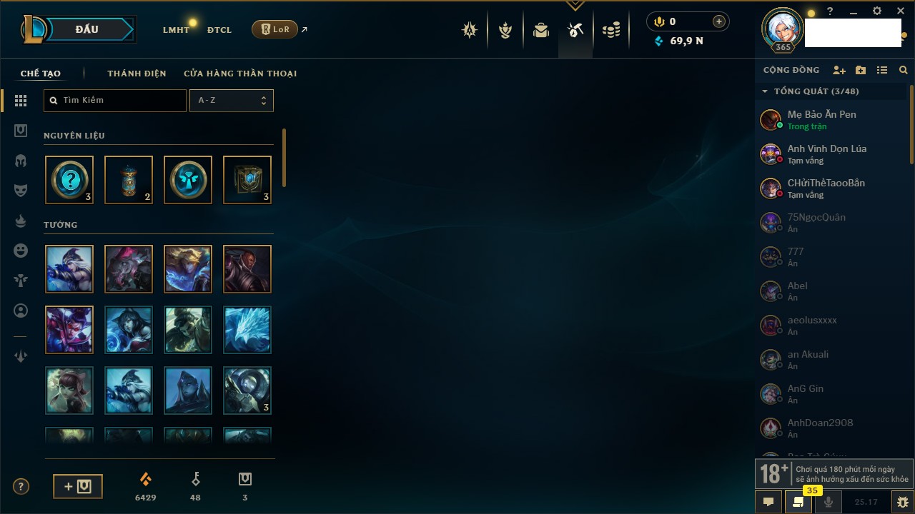 Rank Đơn: Bạch Kim IVKhung: VàngTướng: 170 - Còn 34137 THXTrang Phục: 209Rank ĐTCL: Chưa RankLinh Thú: 108
