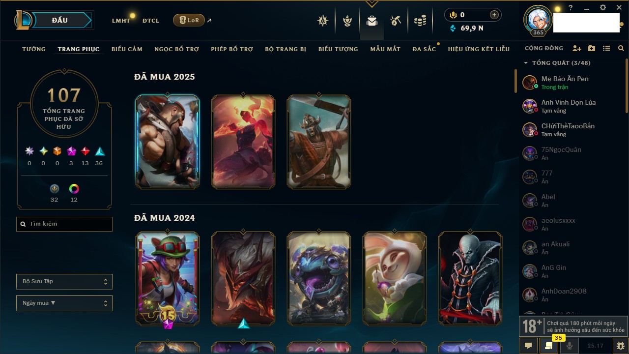 Rank Đơn: Vàng IIIKhung: VàngTướng: 172 - Còn 200315 THXTrang Phục: 87Rank ĐTCL: Chưa RankLinh Thú: 136