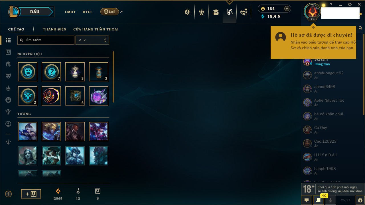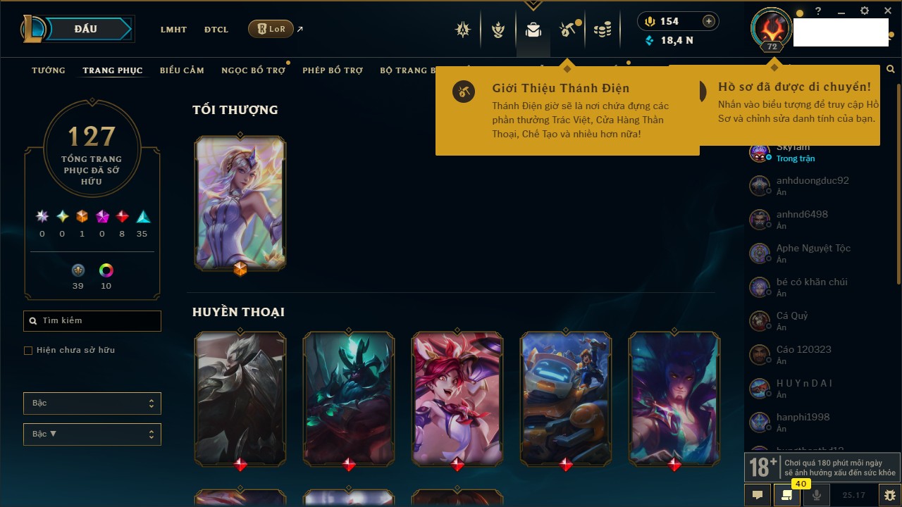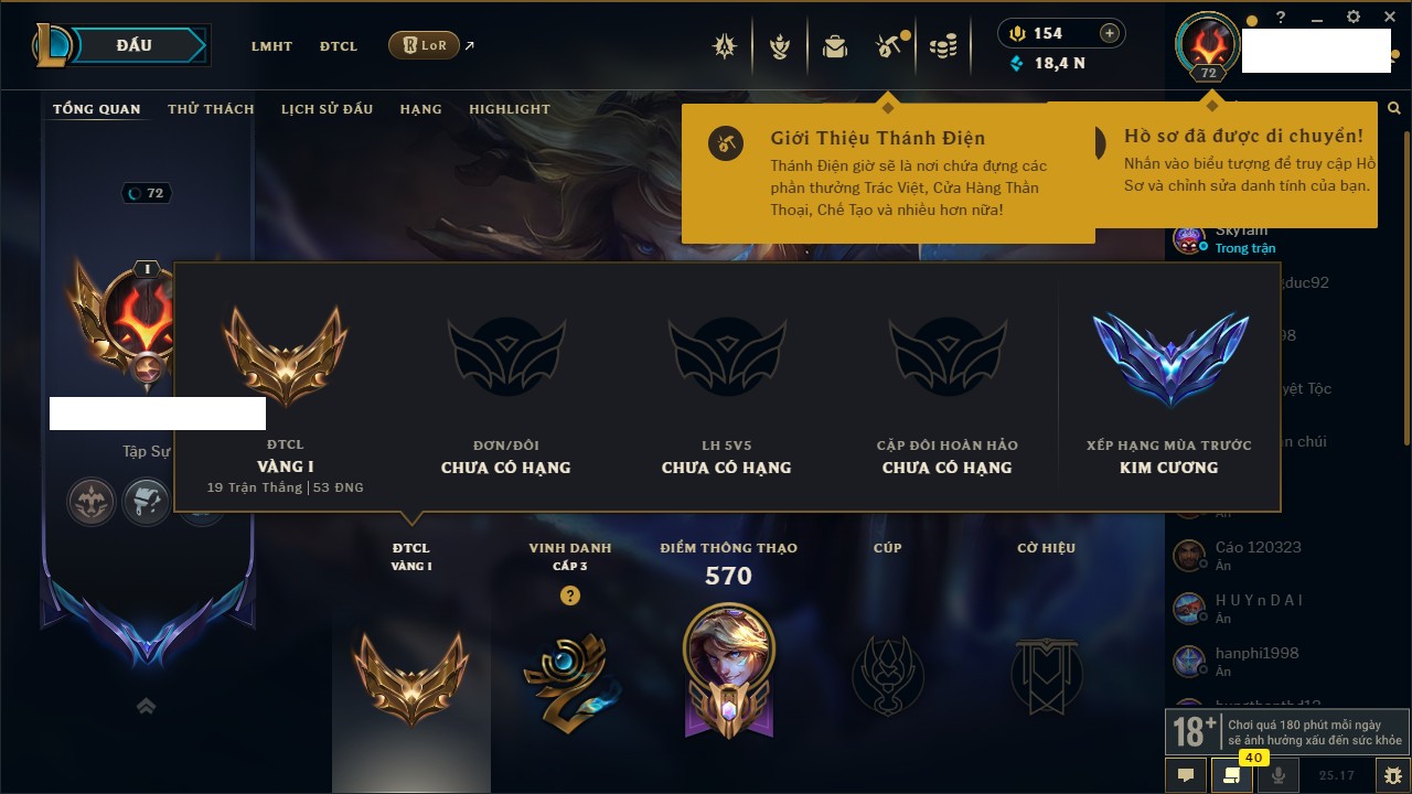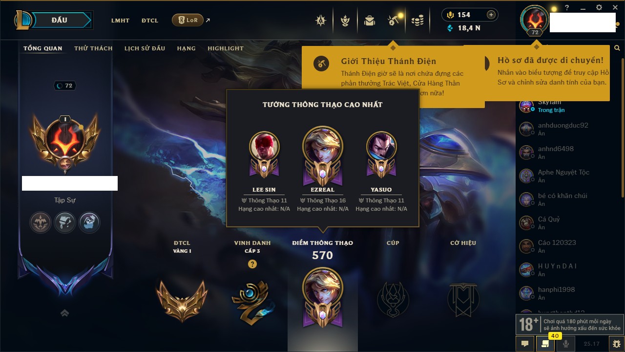 Rank Đơn: Chưa RankKhung: Chưa có khungTướng: 154 - Còn 18477 THXTrang Phục: 127Rank ĐTCL: Vàng ILinh Thú: 183