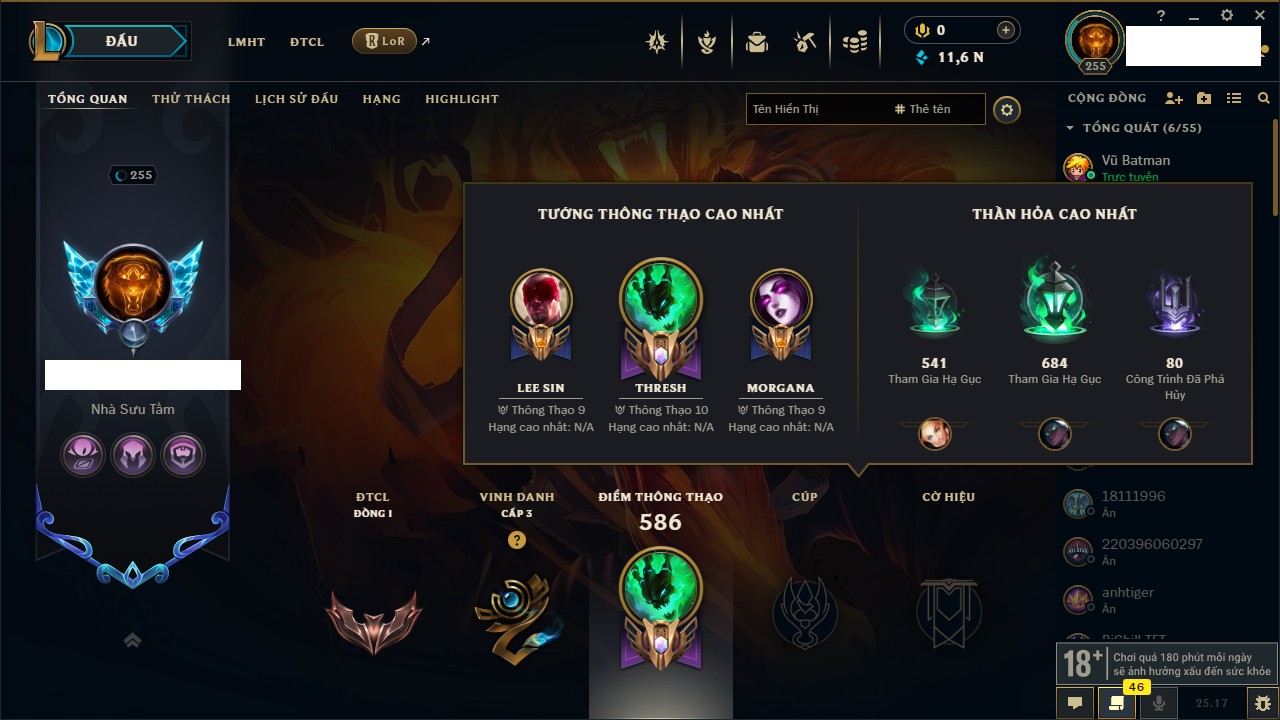 Rank Đơn: Bạc IIIKhung: Chưa có khungTướng: 171 - Còn 21493 THXTrang Phục: 252Rank ĐTCL: Bạch Kim IVLinh Thú: 123