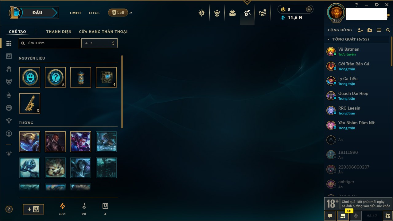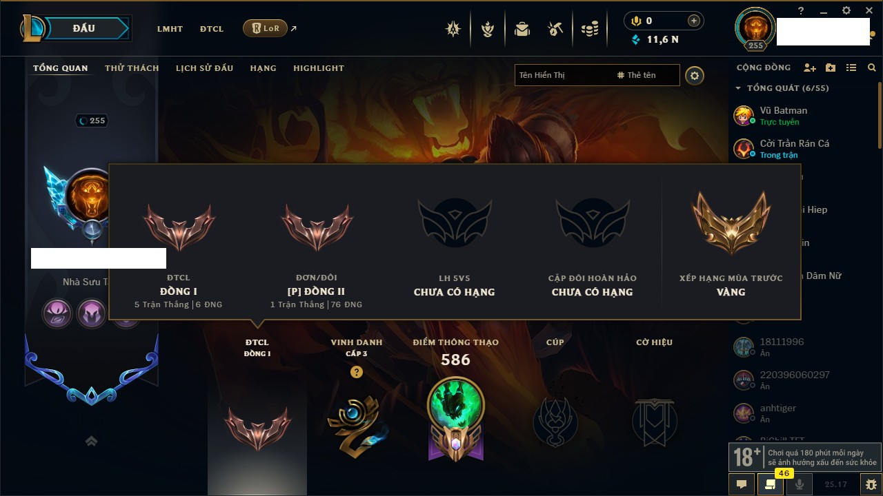 Rank Đơn: Vàng IIKhung: VàngTướng: 171 - Còn 34018 THXTrang Phục: 250Rank ĐTCL: Sắt IILinh Thú: 19