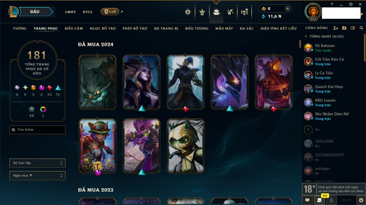 Rank Đơn: Vàng IIIKhung: VàngTướng: 161 - Còn 162202 THXTrang Phục: 179Rank ĐTCL: Chưa RankLinh Thú: 20