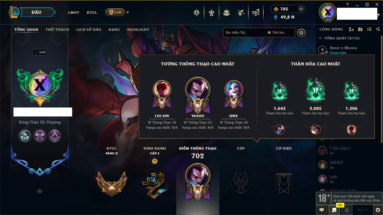 Rank Đơn: Chưa rank mùa nào Khung: Chưa có khung Tướng: 18 - Còn 21345 THX Trang Phục: 2 Rank ĐTCL: Vàng II Linh Thú: 14