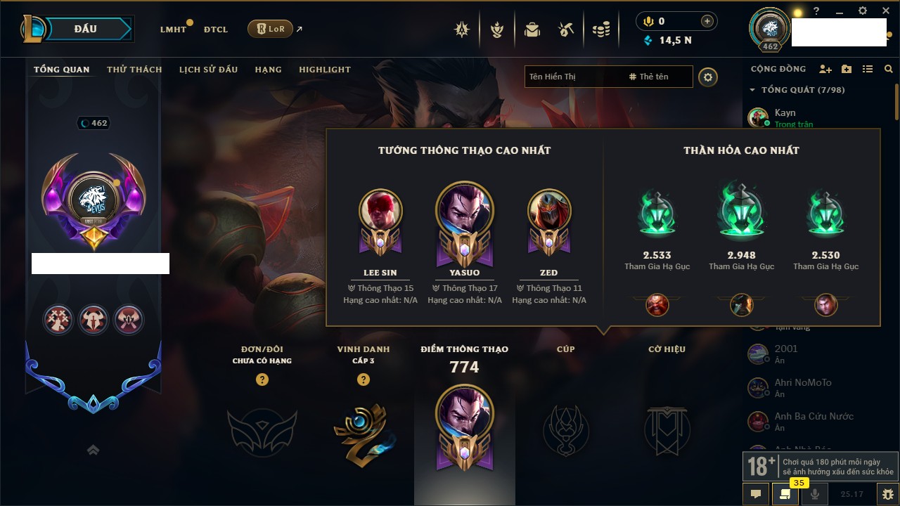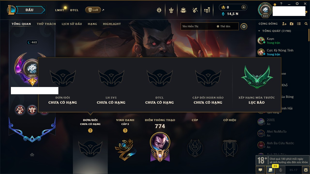 Rank Đơn: Bạch Kim IIKhung: Bạch kimTướng: 171 - Còn 141298 THXTrang Phục: 274Rank ĐTCL: Bạch Kim IILinh Thú: 188