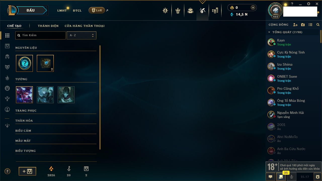 Rank Đơn: Vàng IKhung: BạcTướng: 171 - Còn 60584 THXTrang Phục: 286Rank ĐTCL: Vàng IIILinh Thú: 117