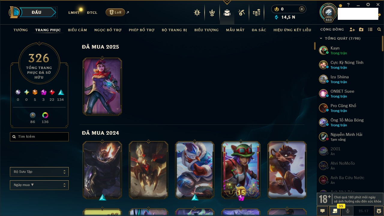 Rank Đơn: Vàng IIIKhung: VàngTướng: 171 - Còn 88128 THXTrang Phục: 329Rank ĐTCL: Chưa RankLinh Thú: 41