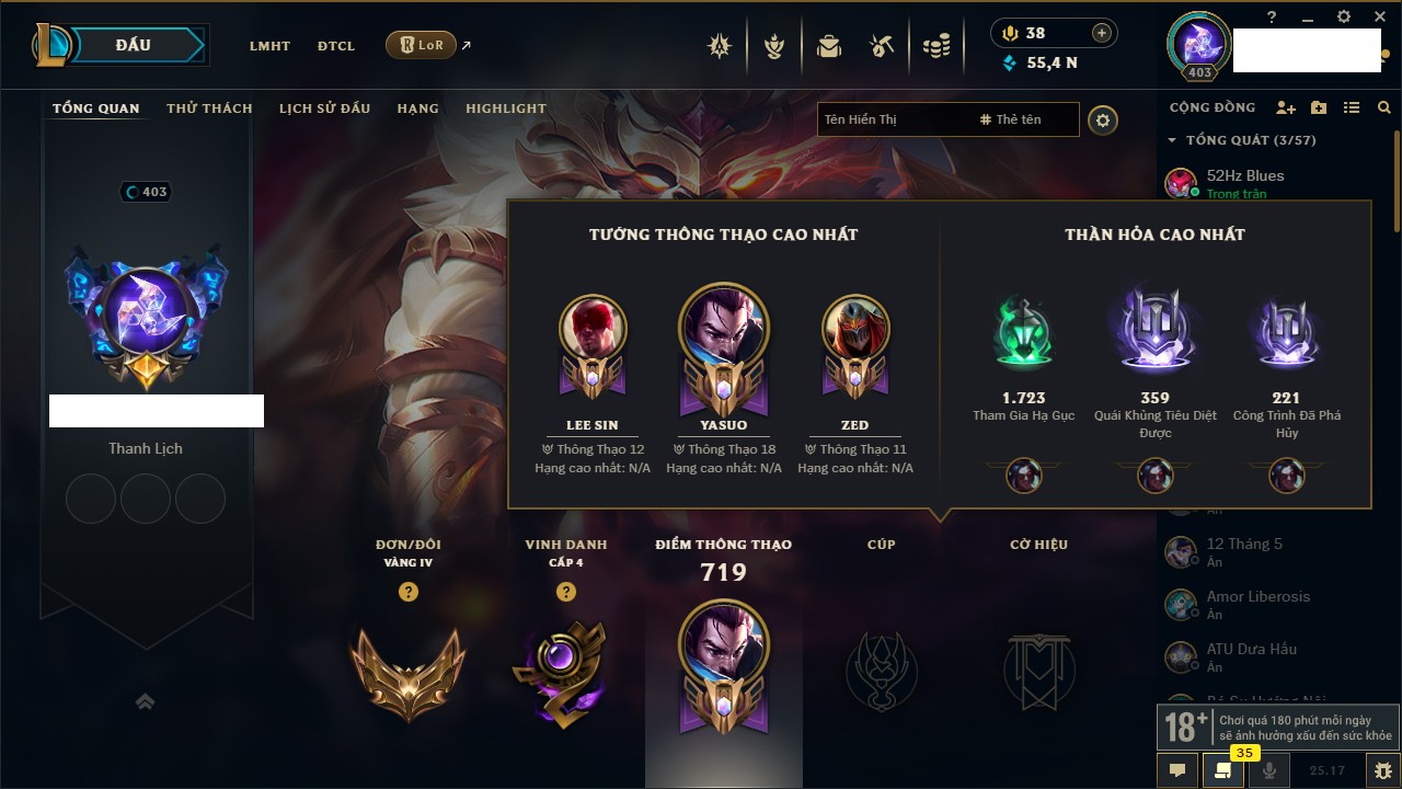 Rank Đơn: Bạch Kim IVKhung: Bạch kimTướng: 171 - Còn 54021 THXTrang Phục: 327Rank ĐTCL: Chưa RankLinh Thú: 115