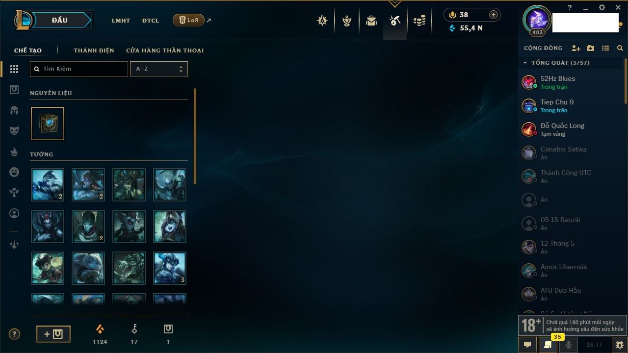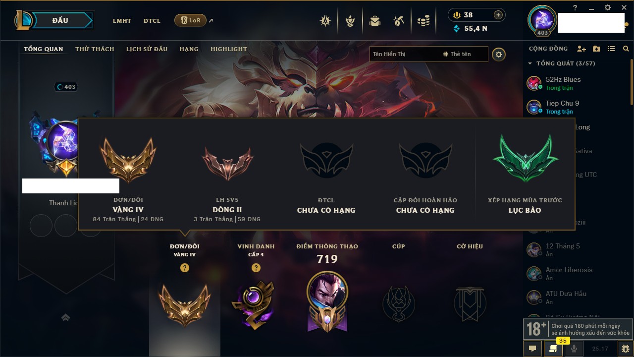 Rank Đơn: Vàng IKhung: BạcTướng: 171 - Còn 60584 THXTrang Phục: 286Rank ĐTCL: Vàng IIILinh Thú: 117