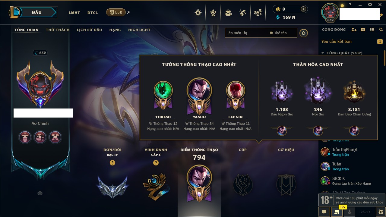 Rank Đơn: Đồng IVKhung: Chưa có khungTướng: 162 - Còn 32315 THXTrang Phục: 275Rank ĐTCL: Chưa RankLinh Thú: 33