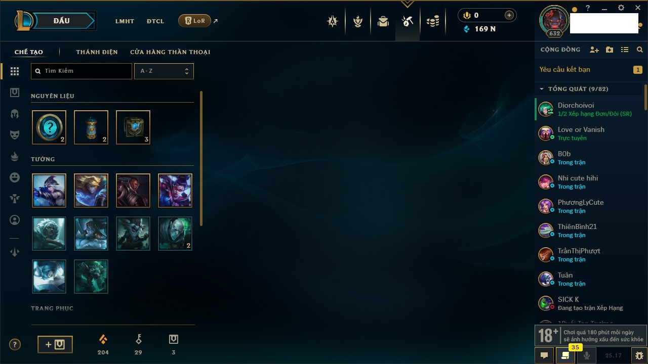 Rank Đơn: Bạc IIIKhung: BạcTướng: 170 - Còn 76760 THXTrang Phục: 235Rank ĐTCL: Chưa RankLinh Thú: 183