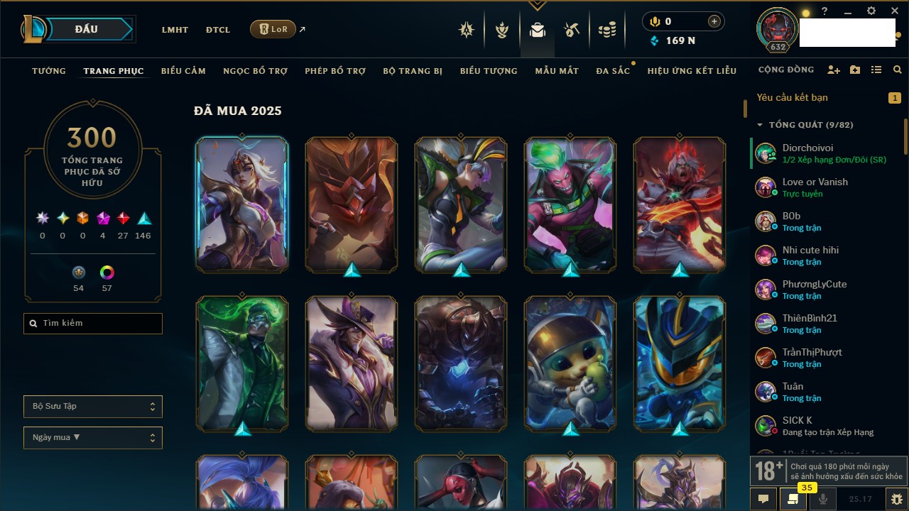 Rank Đơn: Vàng IVKhung: VàngTướng: 170 - Còn 207451 THXTrang Phục: 275Rank ĐTCL: Chưa RankLinh Thú: 186