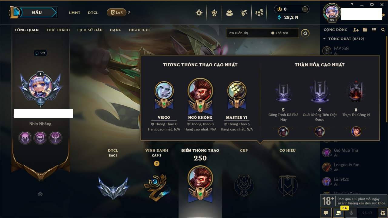 Rank Đơn: Đồng IIKhung: ĐồngTướng: 170 - Còn 66145 THXTrang Phục: 215Rank ĐTCL: Chưa RankLinh Thú: 52
