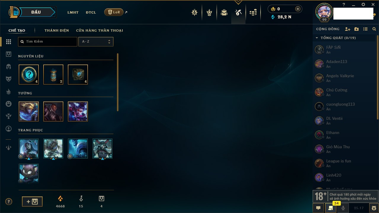 Rank Đơn: Vàng IIIKhung: BạcTướng: 171 - Còn 101359 THXTrang Phục: 88Rank ĐTCL: Kim Cương IVLinh Thú: 200