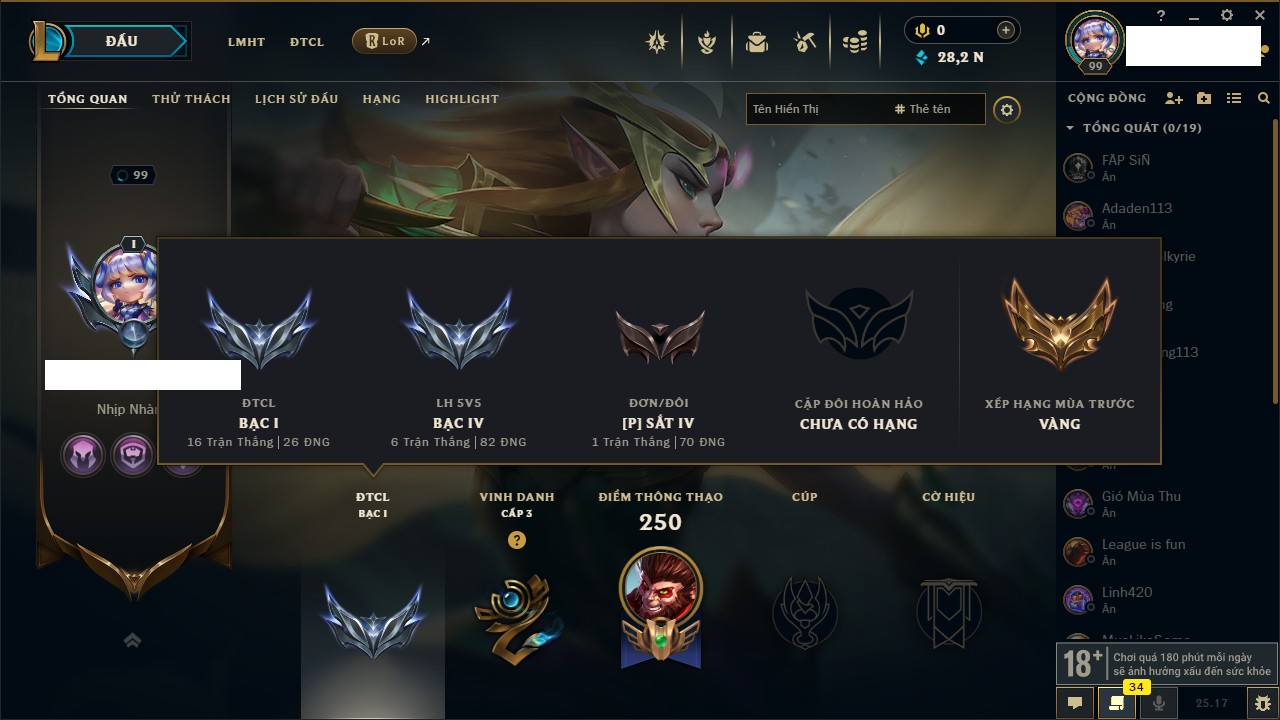 Rank Đơn: Đồng IVKhung: ĐồngTướng: 167 - Còn 28219 THXTrang Phục: 187Rank ĐTCL: Chưa RankLinh Thú: 112